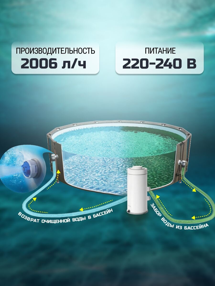 Этот фильтр-насос работает от стандартной сети 220-240 вольт и потребляет всего 45 Вт мощности, что делает его экономичным и удобным в использовании. Он оснащен надежной системой подключения с диаметром отверстия для шлангов 32 мм, что гарантирует простоту установки и надежность в эксплуатации. Рекомендуется для использования как в стационарных, так и в каркасных и надувных бассейнах.