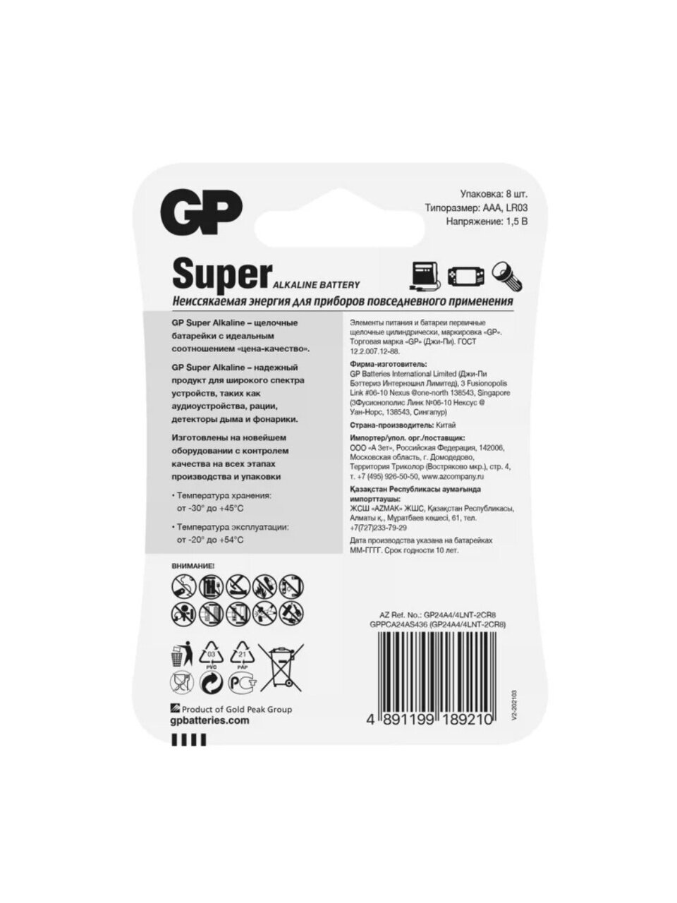 Вы можете приобрести «Батарейка GP, ААА (LR03, 24A), Alkaline Super, щелочная, 1.5 В, блистер, 8 шт, 24A4/4-2CR8, 18779» и другие товары в нашем интернет-магазине в Твери по низким ценам и с бесплатным самовывозом.