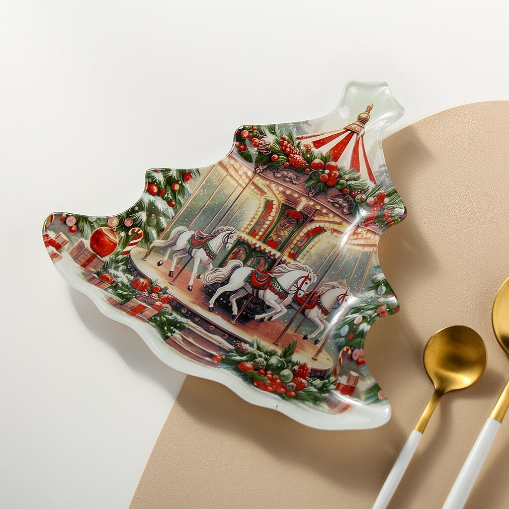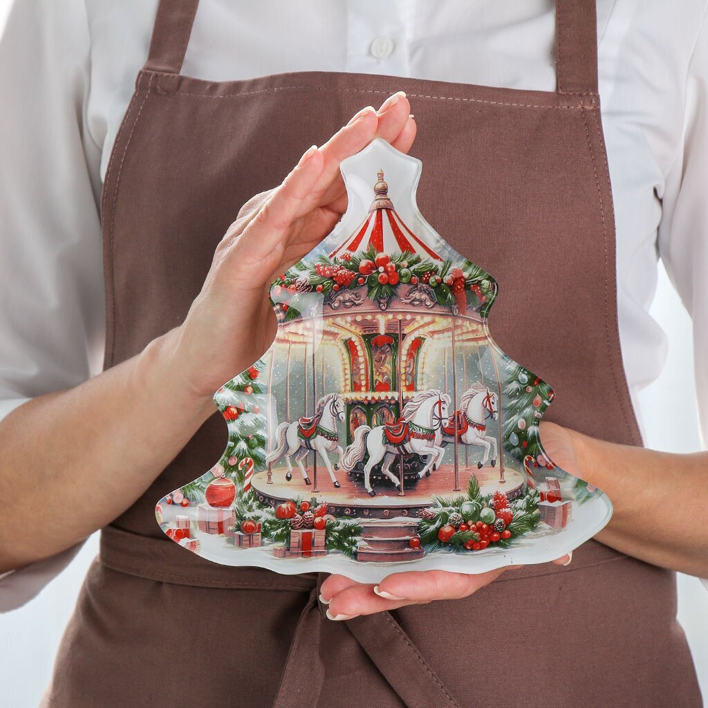 Блюдо Daniks Символ года 2026 Карусель — это не просто праздничная посуда, а функциональный элемент для сервировки закусок, нарезки или сыра. Эффектная форма ёлки с ярким рисунком делает его центром внимания на новогоднем столе или тематической вечеринке. Для тех, кто ищет, какое блюдо выбрать для сервировки на Новый год, это изделие сочетает стиль и практичность.