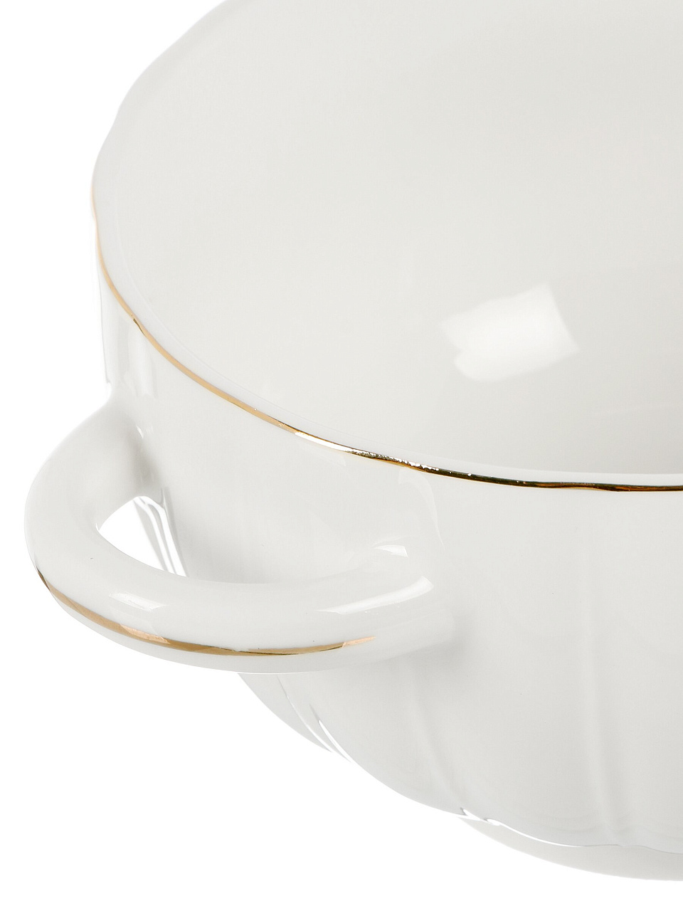 Фарфор термостоек, но из-за декоративной золотистой линии не рекомендуется использовать бульонницу в микроволновой печи — это сохранит декор и продлит срок службы.