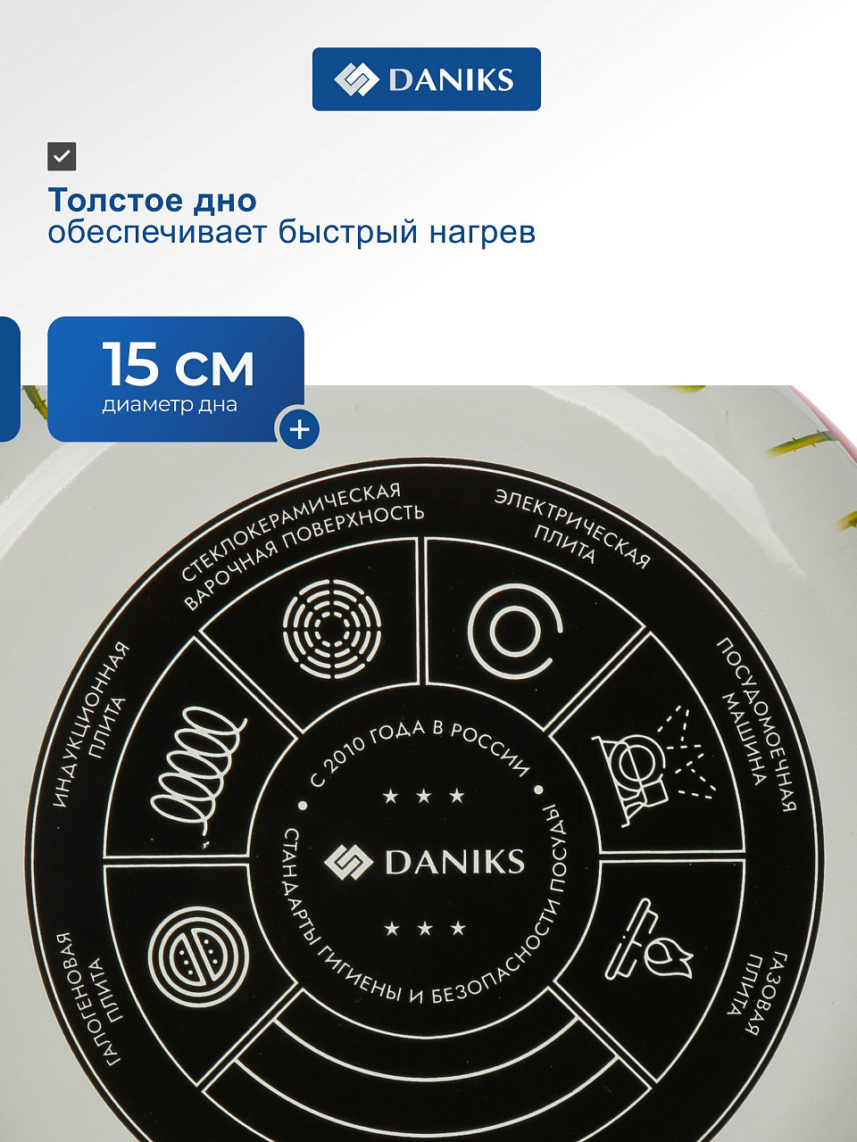 Часто спрашивают, чем отличается эмалированный чайник от обычного металлического: эмаль препятствует появлению накипи и продлевает срок службы изделия, а также сохраняет вкус воды. Daniks «Маки» не имеет свистка — это удобно для тех, кто предпочитает тишину или использует чайник для подогрева воды в больших объемах. Как выбрать чайник для дачи или подарка? Обратите внимание на универсальность: этот чайник легко моется в посудомоечной машине, подходит для любых плит и гармонично впишется в интерьер благодаря декору «Маки».