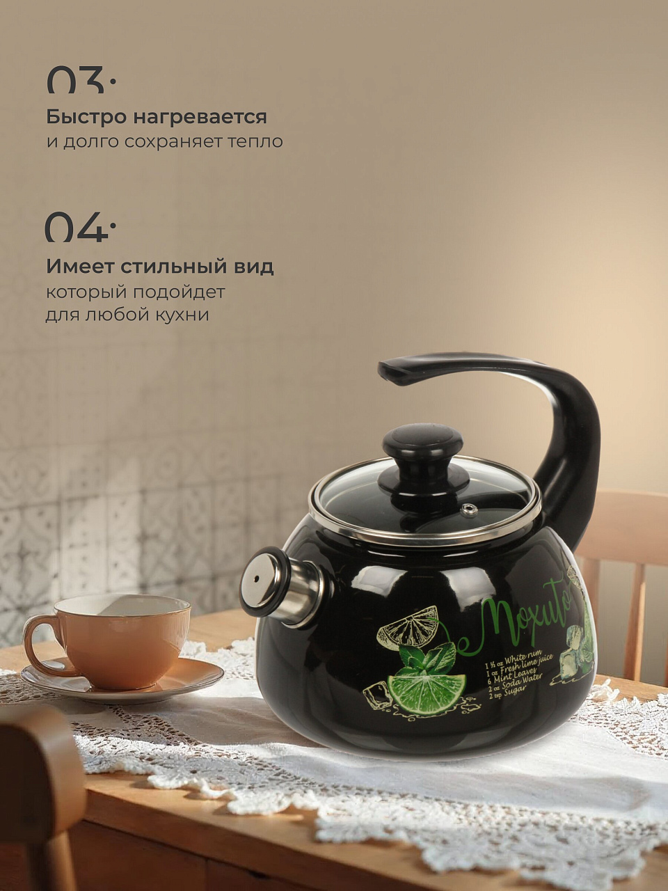 Вы можете приобрести «Чайник сталь, эмалированное покрытие, 2 л, со свистком, ручка консольная, Керченский металлургический завод, Мохито, черный, 43615-103/4.02-У4» и другие товары в нашем интернет-магазине в Казани по низким ценам и с бесплатным самовывозом.