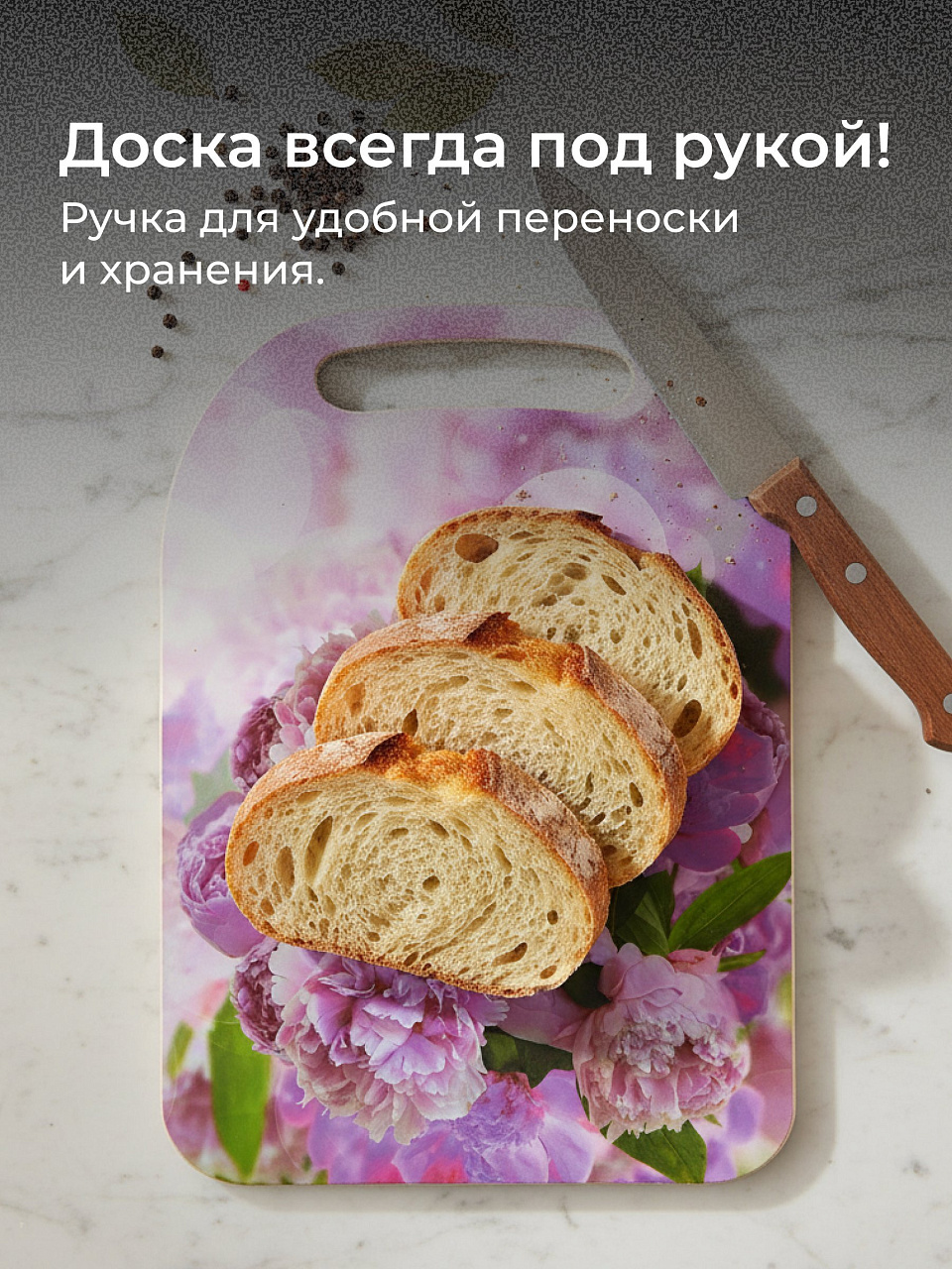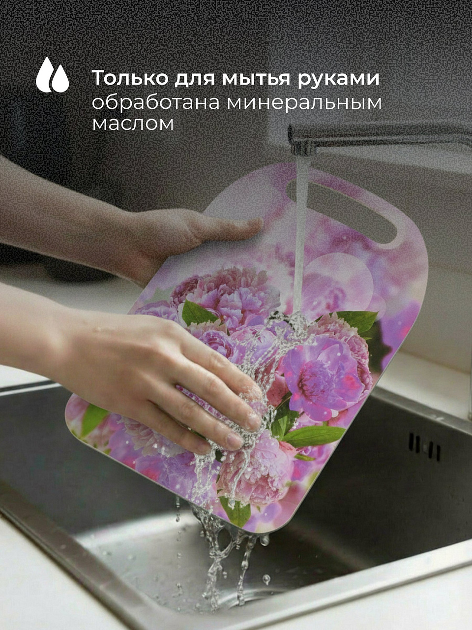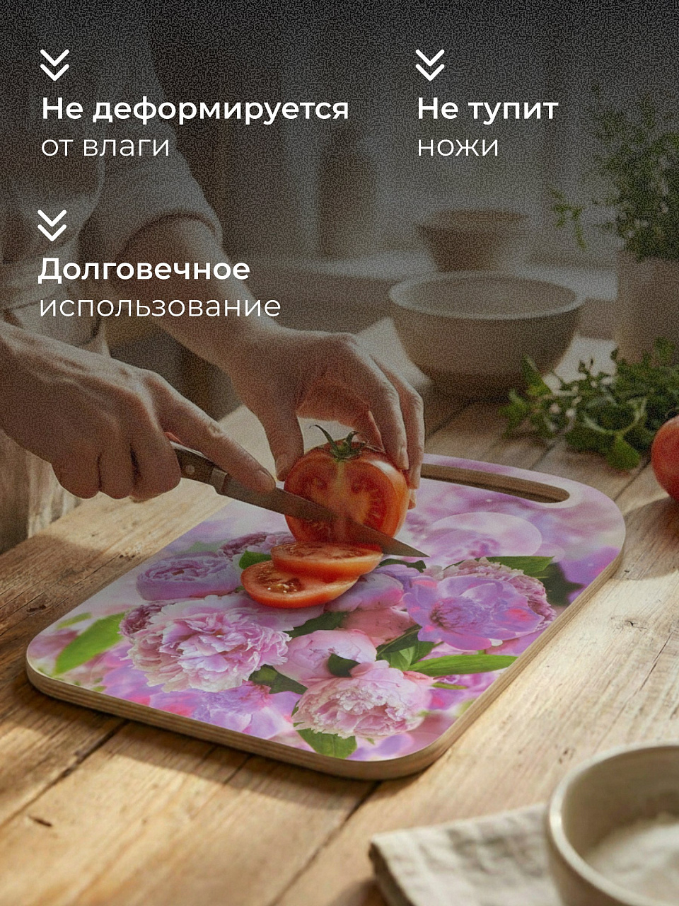 Разделочная доска из дерева с ярким дизайном "Пионы" — стильный и практичный аксессуар для кухни. Размер 29х21 см идеально подходит для нарезки хлеба, овощей, фруктов и сервировки блюд. Прочная ручка обеспечивает удобство использования и подвешивания. Натуральный материал безопасен для продуктов, а декоративный рисунок добавит уюта интерьеру.