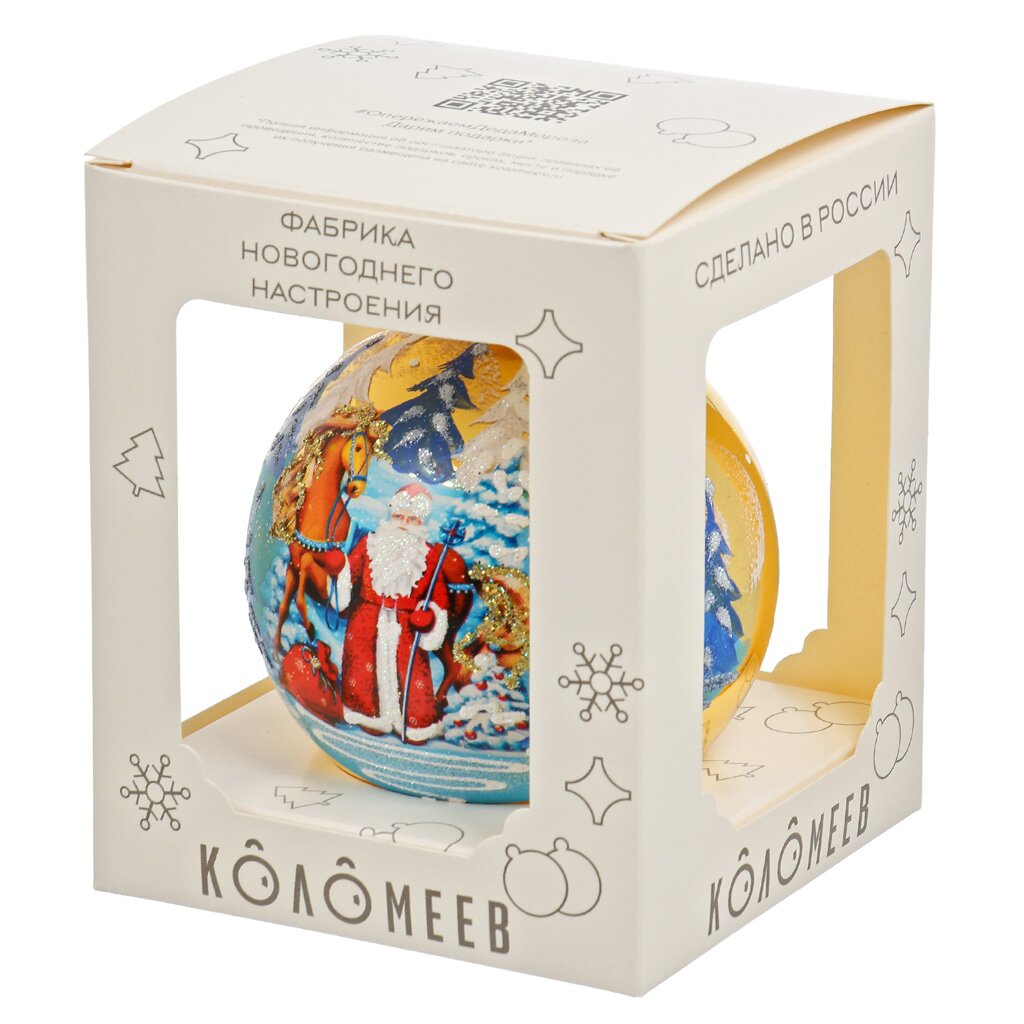 Елочный шар «Дед Мороз и лошадка» диаметром 10 см изготовлен из прочного стекла и декорирован вручную. Благодаря уникальной росписи и золотому блеску, игрушка гармонично впишется в классический или современный интерьер, украсит небольшую или большую елку. Часто спрашивают, какой елочный шар выбрать для подарка — этот вариант идеально подойдет благодаря красивой упаковке и универсальному дизайну.