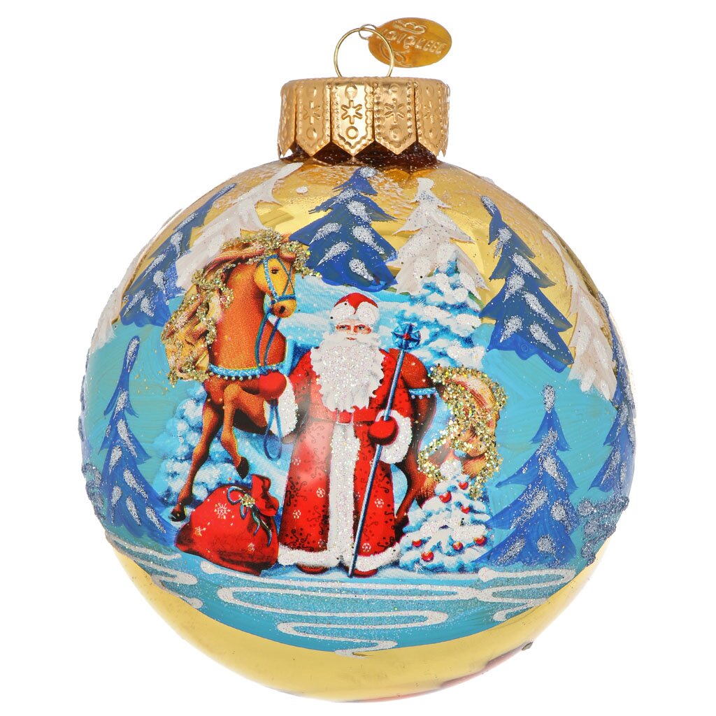 Елочный шар «Дед Мороз и лошадка» 10 см — эксклюзивная ручная роспись, премиальное стекло, идеален для стильного декора и подарка на Новый год.