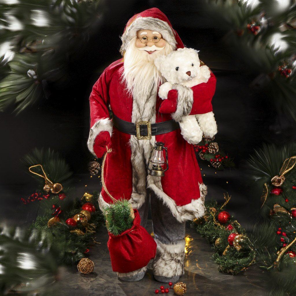 Кто будет охранять ваши сувениры под елочкой до назначенного часа? Кто исполнит желания и подарит счастье в грядущем году? Кто наградит добродушной улыбкой и поднимет настроение? Конечно, старичок Санта Клаус! Фигура Санты выполнена в лучших традициях Рождества: красная шубка с густой опушкой, теплые сапожки и колпак, а в руках расположены мешок с презентами и фонарик.