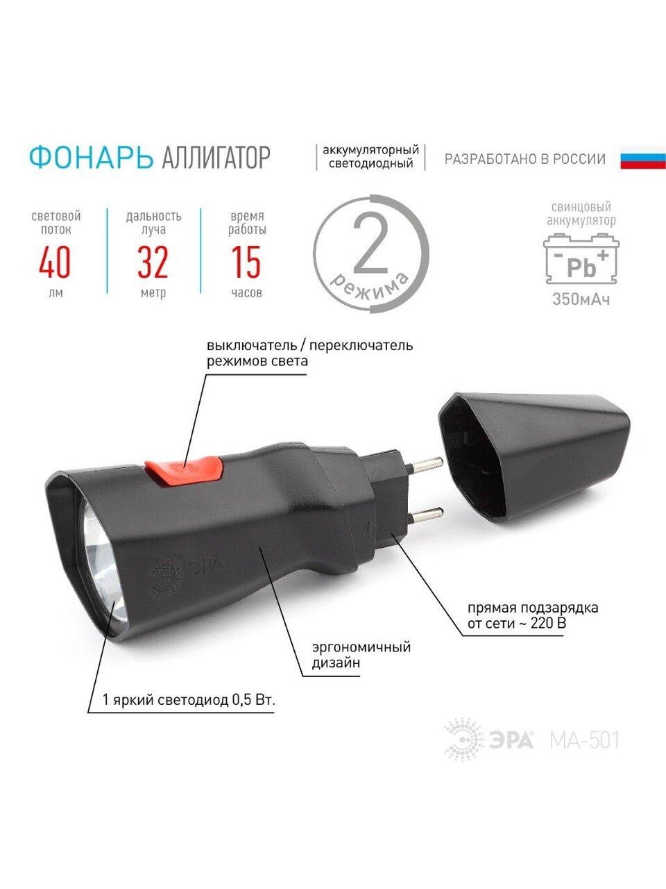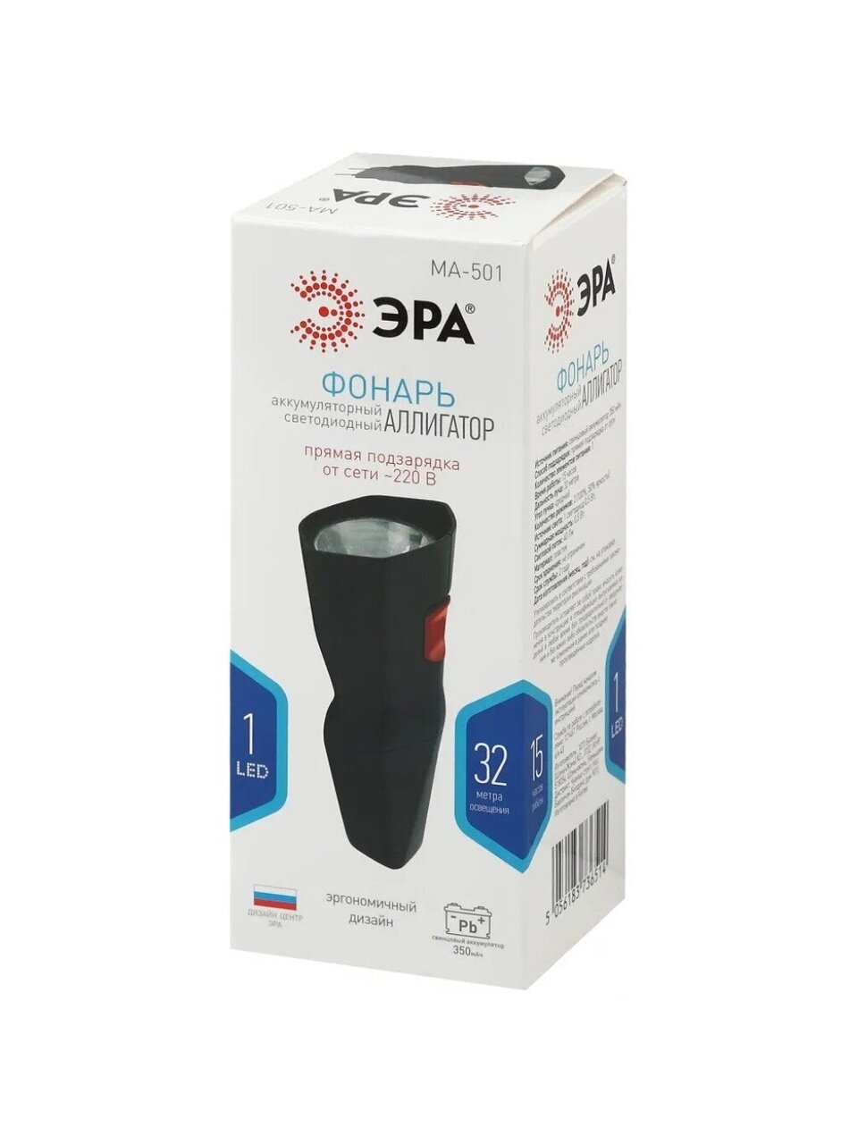 ЭРА MA-501 Аллигатор - удобный ручной фонарь собственной разработки ЭРА. Поставляется в презентабельной коробке, демонстрирующей необычный дизайн устройства.