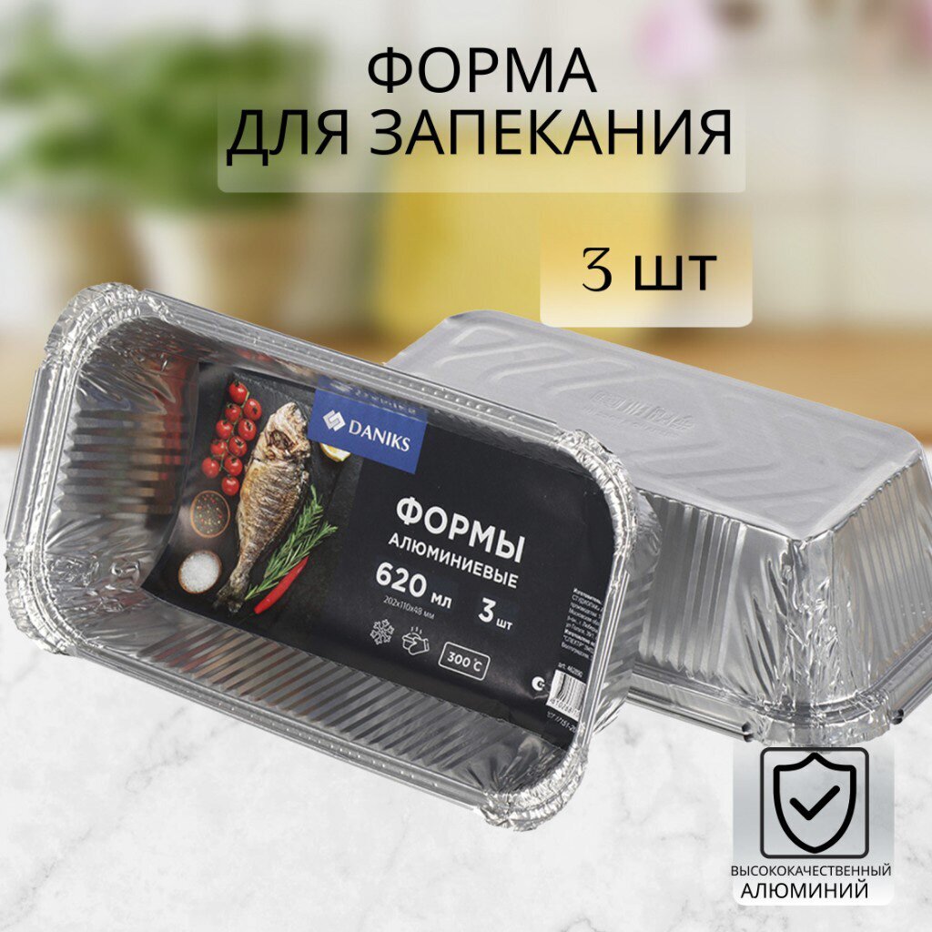 Форма для запекания Daniks 61L — это практичный набор из трёх одноразовых алюминиевых форм, который позволит легко приготовить пироги, хлеб или рыбу в духовке. Благодаря оптимальному размеру и прямоугольной форме, изделия подходят для большинства домашних и дачных рецептов. Если вы ищете, какую форму для запекания выбрать для рыбы или хлеба, обратите внимание на алюминиевые варианты: они быстро нагреваются, сокращая время приготовления, и не требуют мытья после использования.
