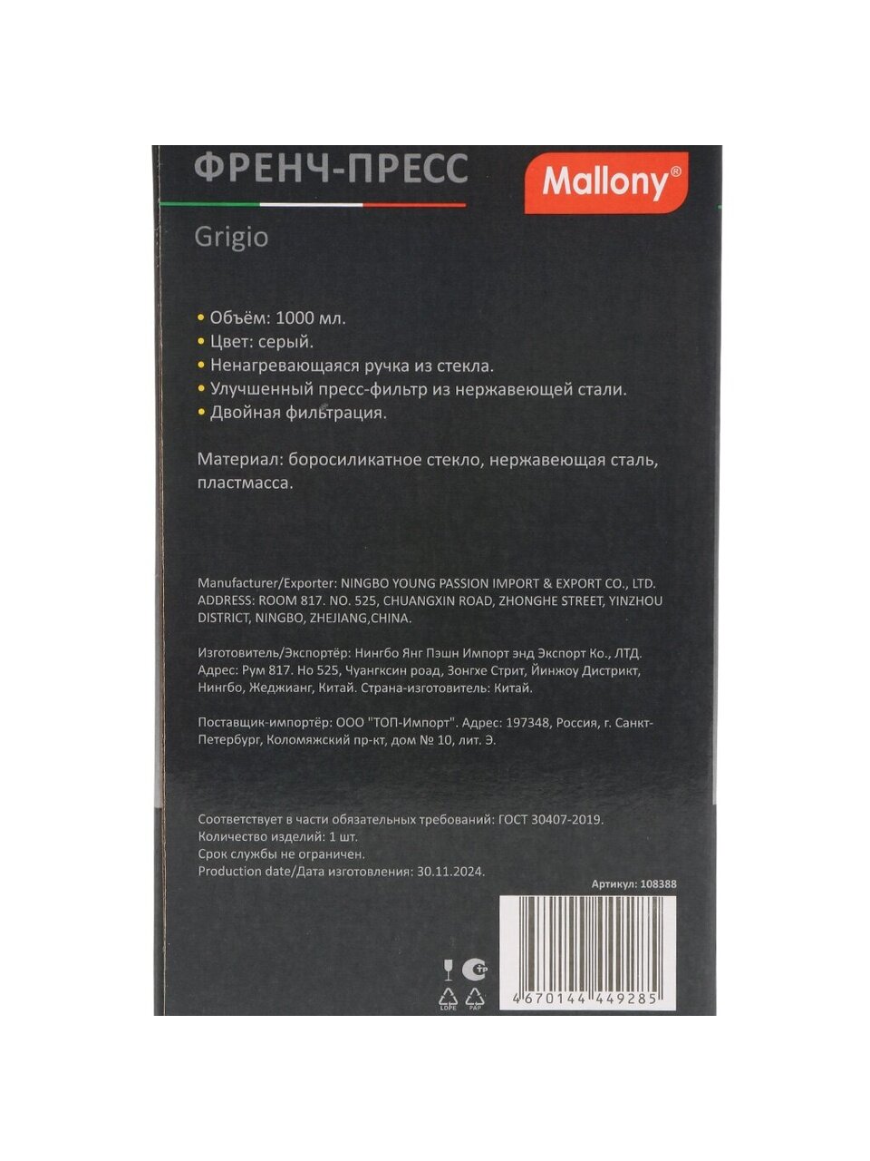 Френч-пресс Mallony Grigio рассчитан на 1 литр, выполнен из термостойкого стекла и нержавеющей стали, артикул 108388, страна производства — Китай.