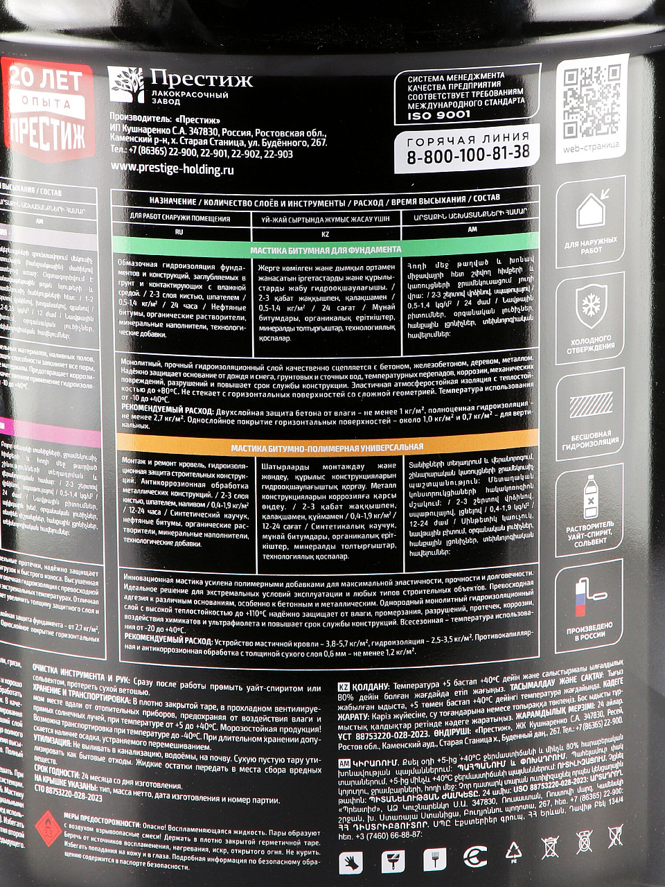 Объём — 7 кг, цвет — чёрный. Основа — битумная, растворители: уайт-спирит и сольвент. Производство — Россия.