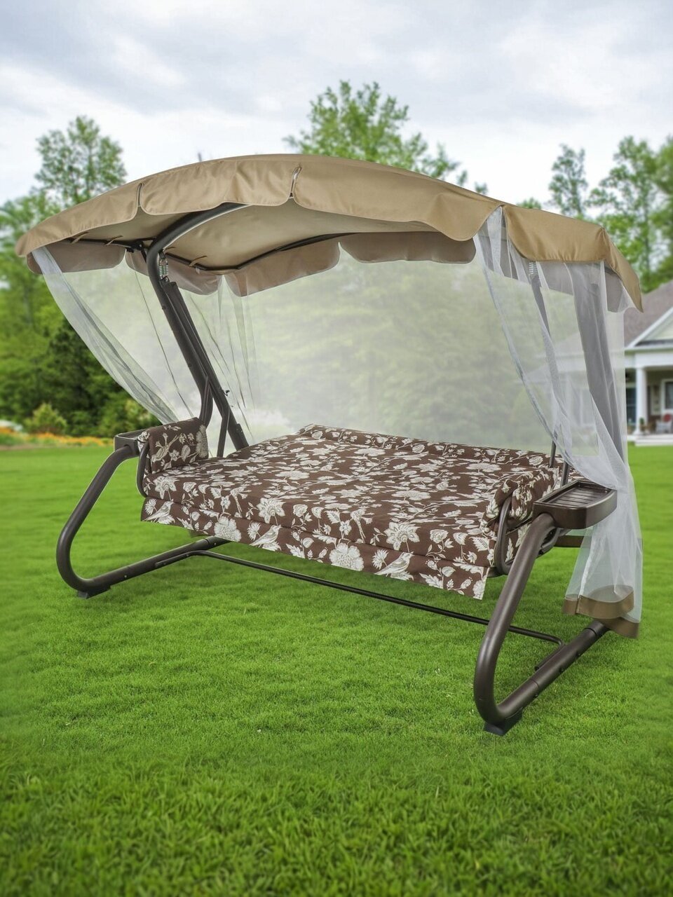 Вы можете приобрести «Качели садовые 3-местные, 238.2х136.5х180 см, 350 кг, София, раскладываются в кровать, с москитной сеткой, шоколадные, подушка, A28C.541, металл» и другие товары в нашем интернет-магазине в Воронеже по низким ценам и с бесплатным самовывозом.