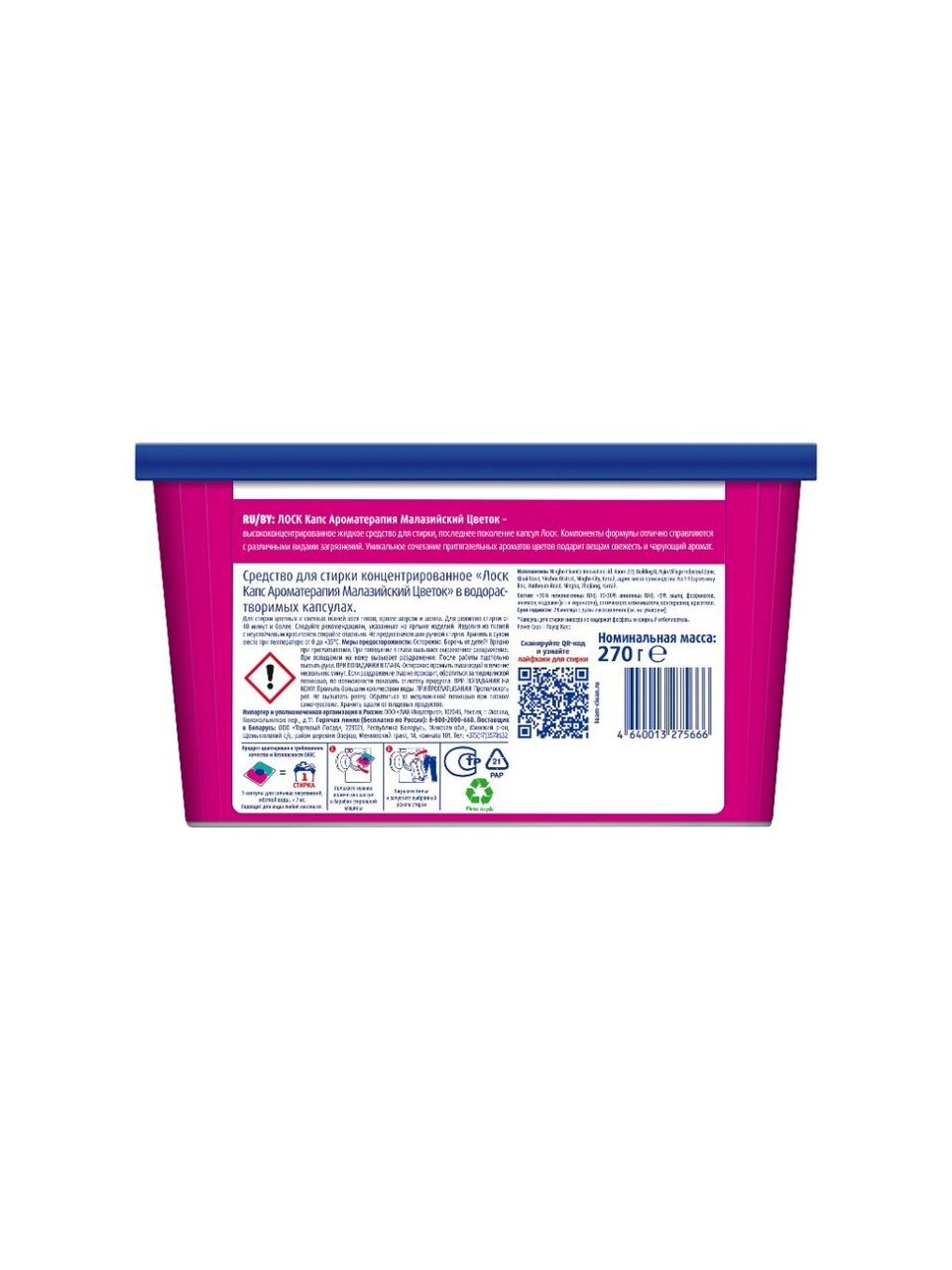 Капсулы для стирки Лоск Ароматерапия Малазийский Цветок предназначены для стирки светлых и цветных вещей всех типов, кроме шерсти и шелка. Компоненты формулы отлично справляются с различными видами загрязнений. Уникальное сочетание притягательных ароматов цветов и эфирных масел дарит вещам длительную свежесть и чарующий аромат.
