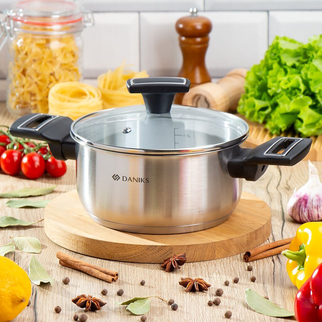 Кастрюля Daniks Айленд 2.2 л из нержавеющей стали с капсульным дном и стеклянной крышкой — идеальное решение для индукционных плит и ежедневной готовки без хлопот.