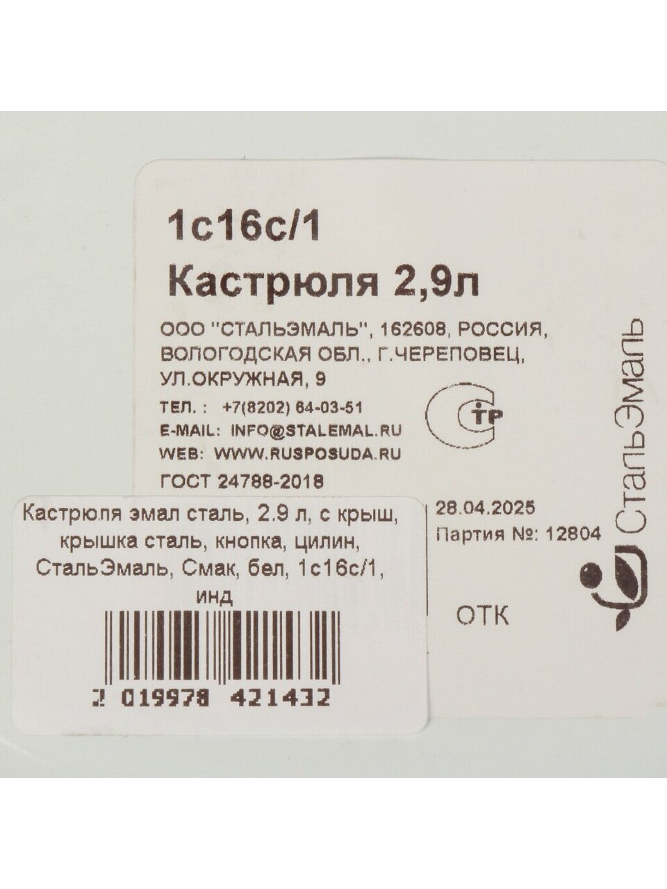 Вы можете приобрести «Кастрюля эмалированная сталь, 2.9 л, крышка сталь, кнопка, цилиндр, СтальЭмаль, Смак, 1с16с/1, белая, индукция» и другие товары в нашем интернет-магазине в Обнинске по низким ценам и с бесплатным самовывозом.