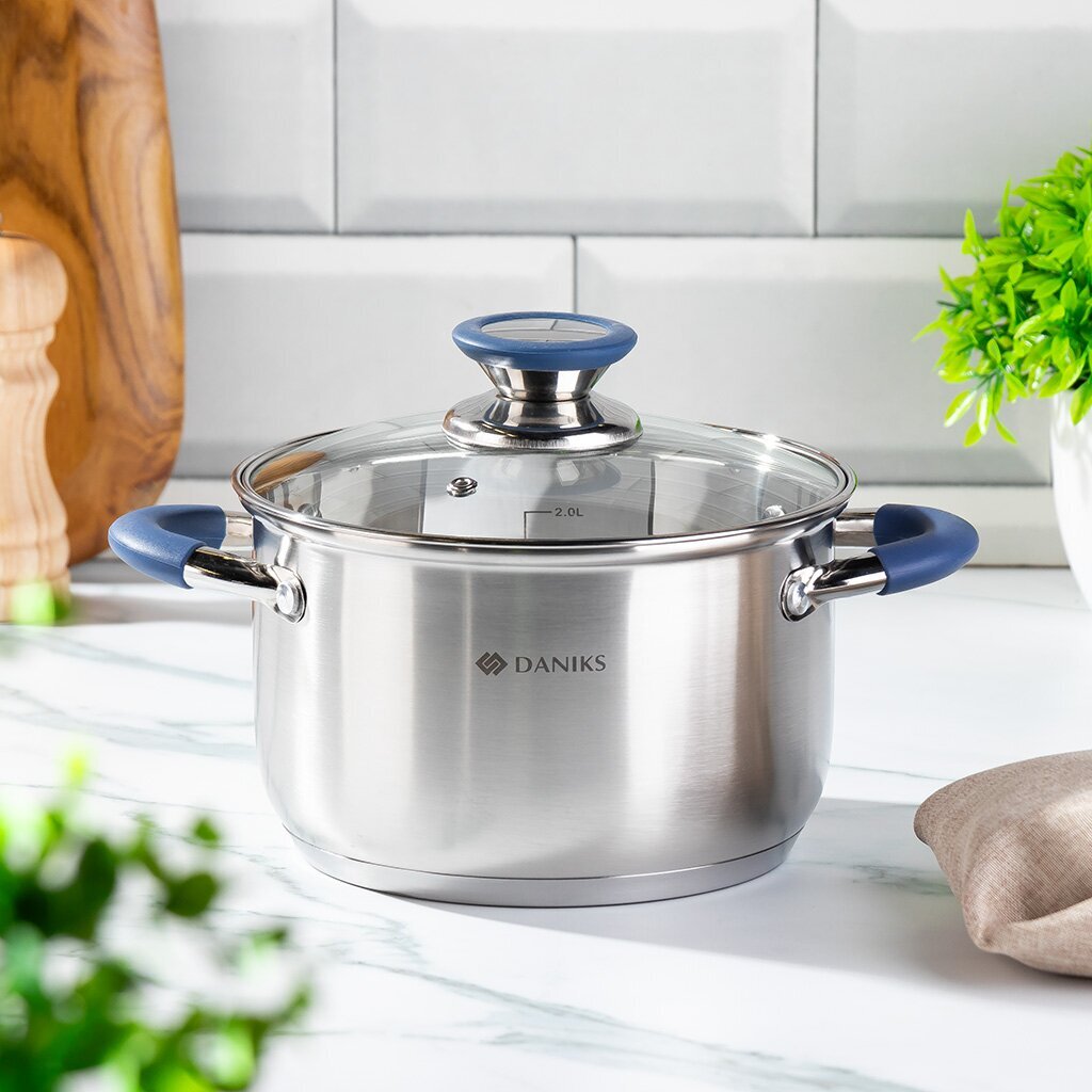 Кастрюля Daniks Сиена 2.9 л из нержавеющей стали: идеальный выбор для индукционных плит, стеклянная крышка, мерная шкала, долговечность и универсальность.