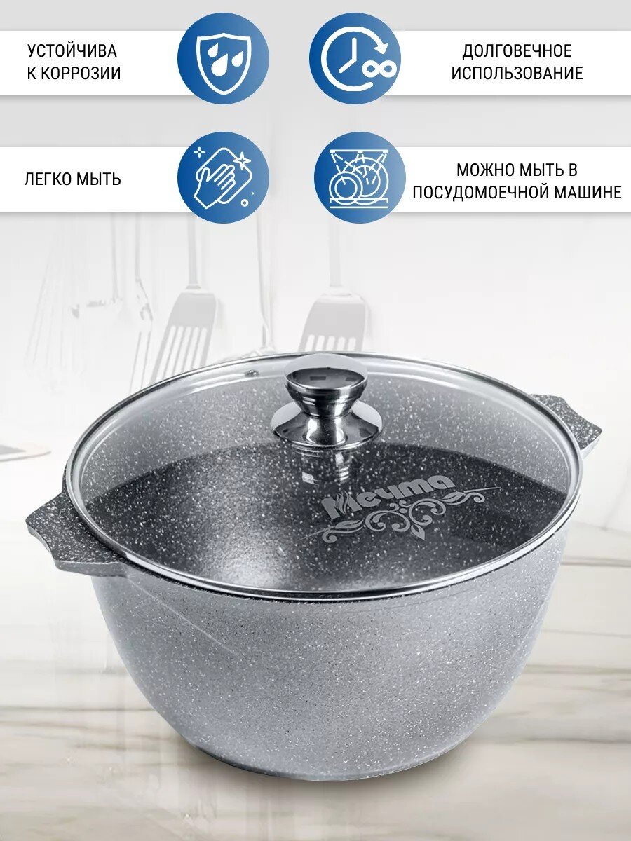 Кастрюля алюминиевая с антипригарным гранитным покрытием 6 л «Мечта Гранит» — идеальное решение для семьи, дачи и подарка: прочная, вместительная, легко моется, не пригорает.