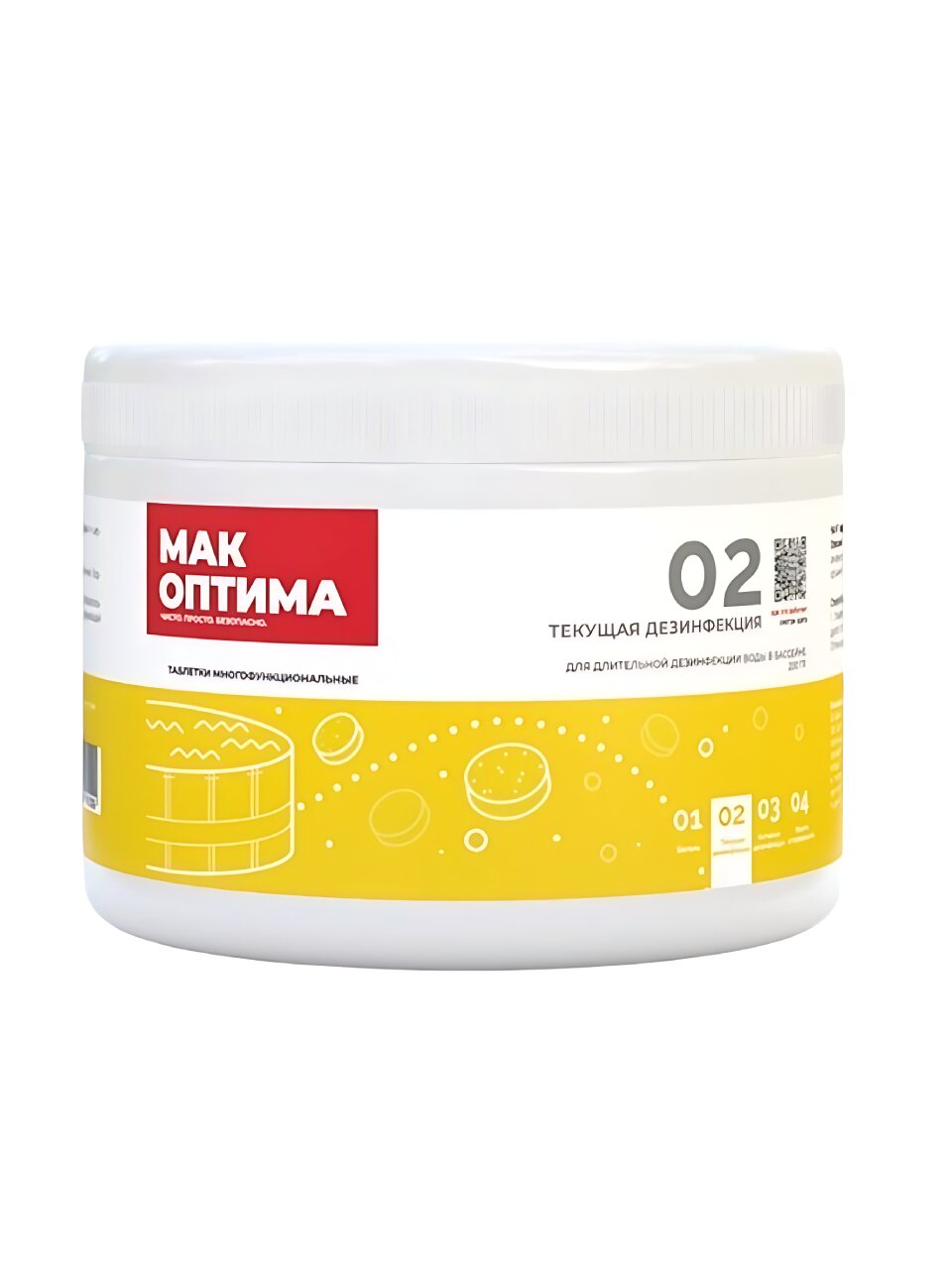 Средство представлено в форме таблеток, каждая из которых весит 200 г, что обеспечивает удобство в использовании и дозировке. Одна таблетка рекомендована к применению на 30 кубических метров воды. MAK 4 разработан на основе трихлоризоциануровой кислоты (симклозен), что гарантирует медленное и равномерное высвобождение активных компонентов, обеспечивая длительное действие и экономичное использование.