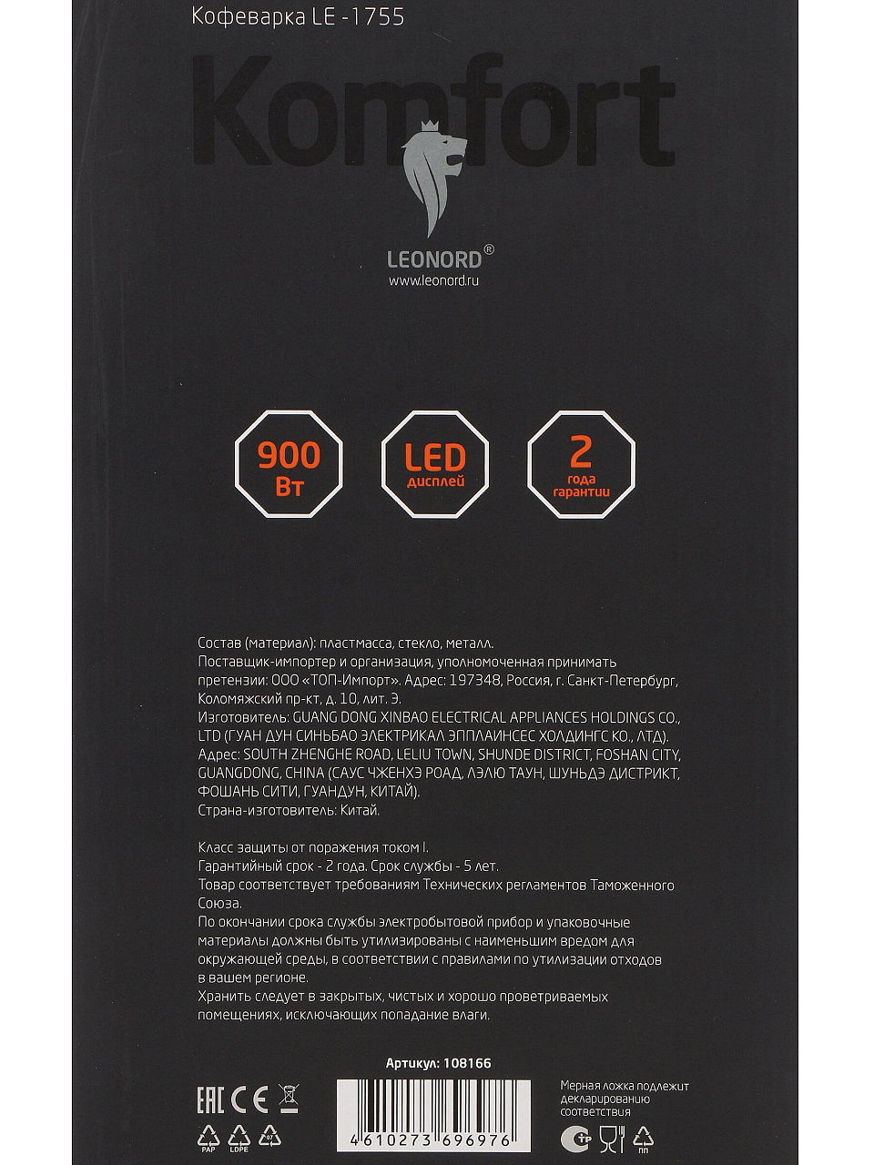 Вы можете приобрести «Кофеварка электрическая, капельная, пластик, 1.5 л, Leonord, LE-1755, 900 Вт, пластиковая ручка, 108166» и другие товары в нашем интернет-магазине в Орле по низким ценам и с бесплатным самовывозом.