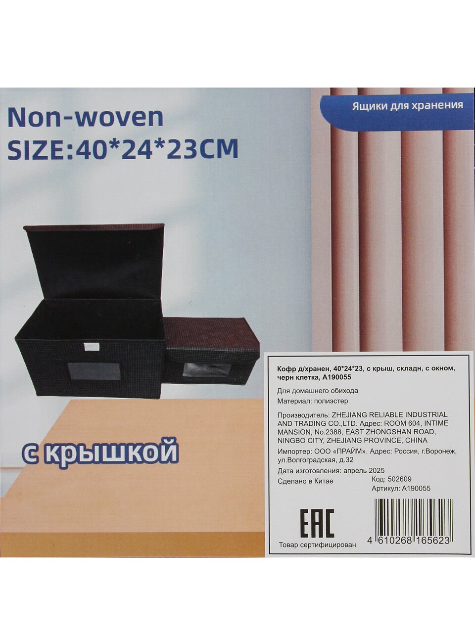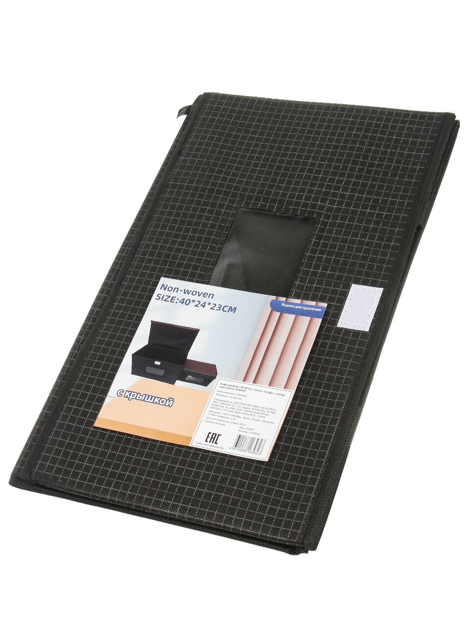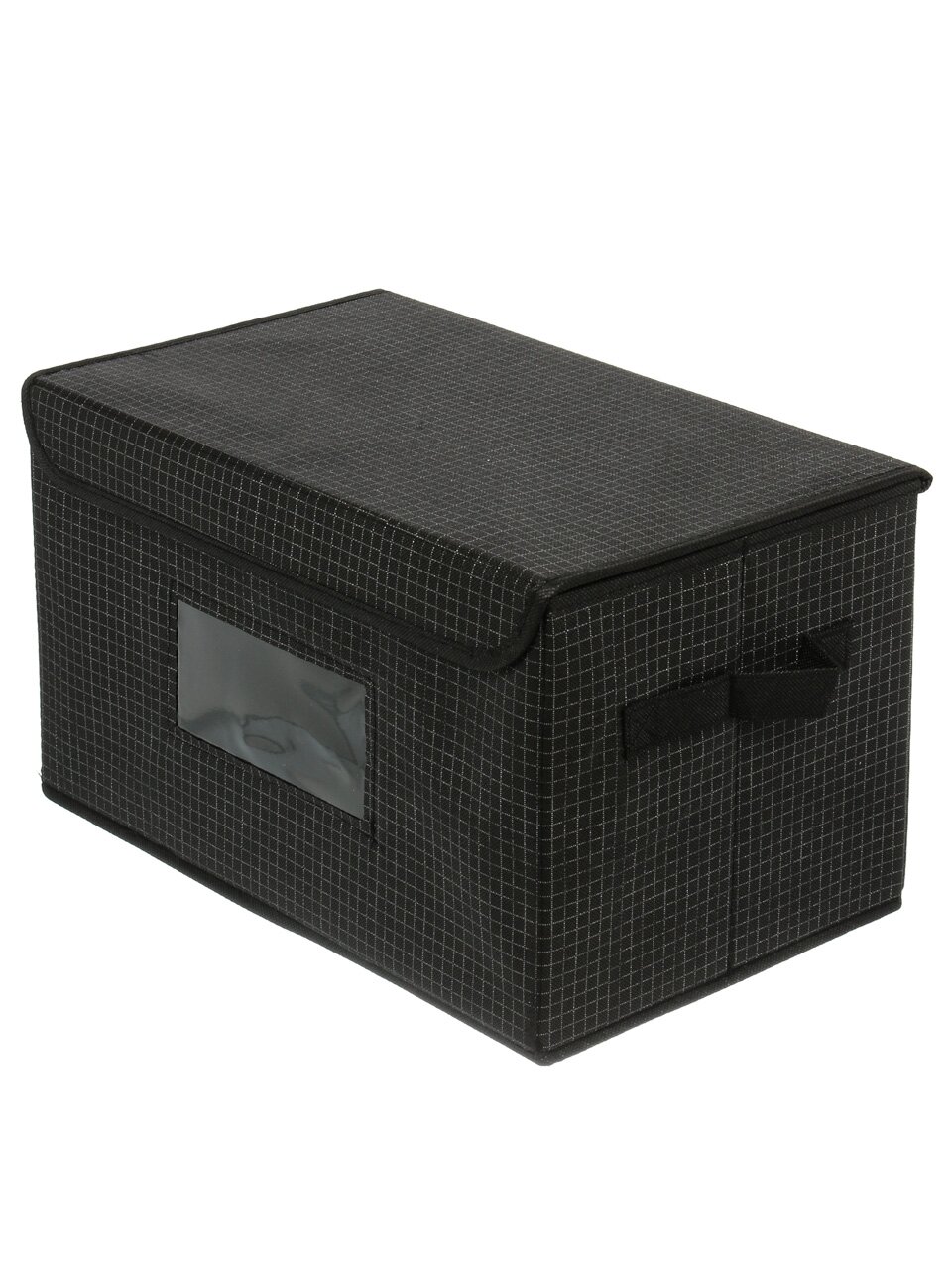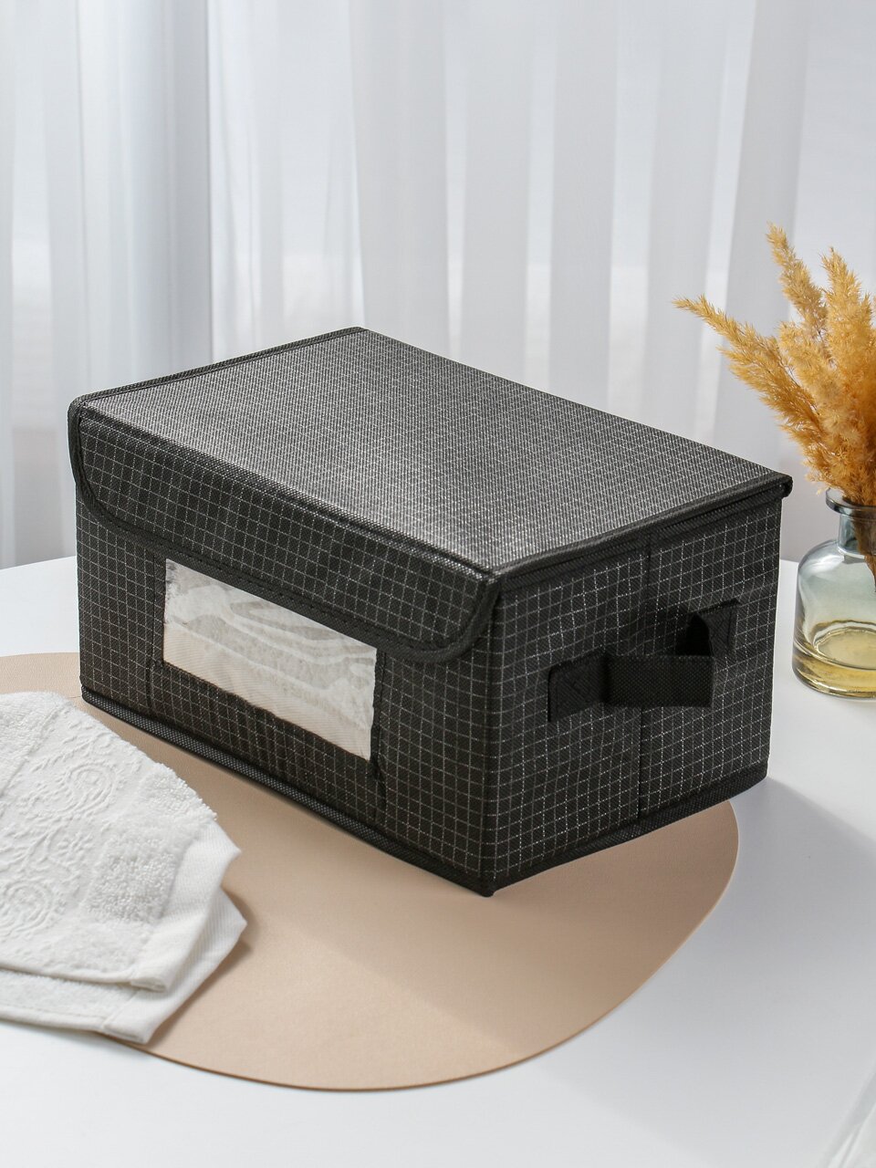 Складной кофр для хранения 40х24х23 см с крышкой и окном: компактное решение для порядка дома и дачи, стиль «черная клетка», надежный полиэстер.