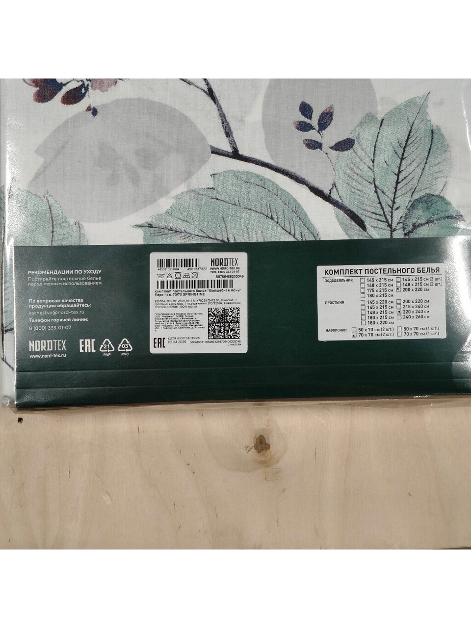 - Универсальный комплект: простыня 220х240 см, пододеяльник 200х220 см, две наволочки 70х70 см — подходит для большинства современных кроватей