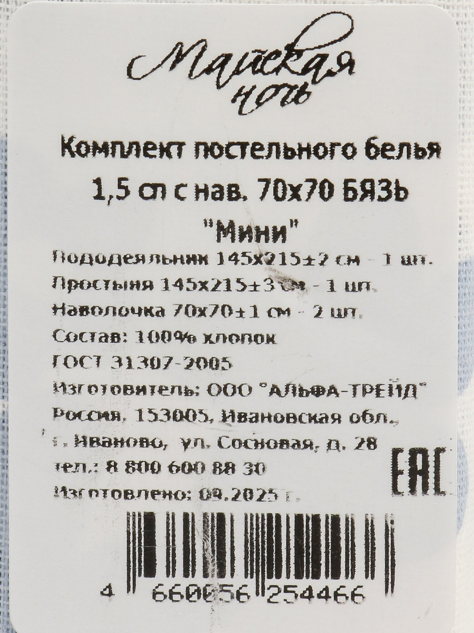 Постельное белье 1.5-спальное, простыня 145х215 см, 2 наволочки 70х70 см, пододеяльник 145х215 см, Майская ночь, бязь, Мини