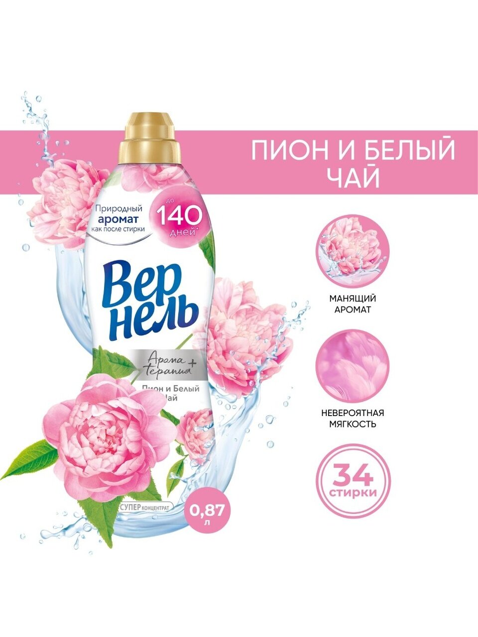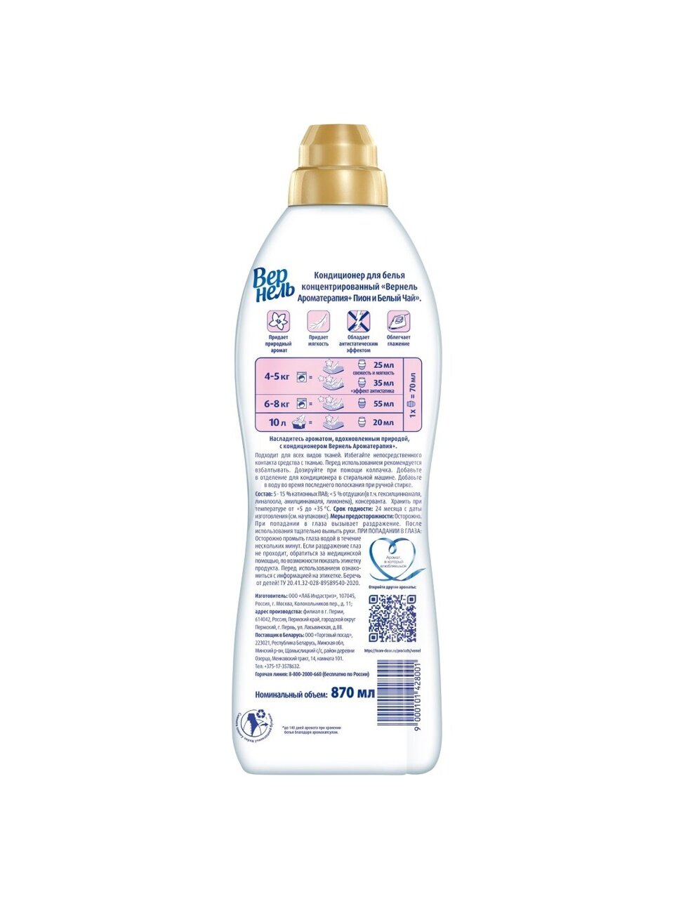 Концентрированный кондиционер для белья Вернель Ароматерапия+ Пион и Белый Чай 870 мл (34 стирки) подарит Вашему белью нежный, расслабляющий аромат, вдохновленный самой природой. Благодаря специальным аромакапсулам кондиционер для стирки Вернель позволит наслаждаться интенсивным ароматом до 140 дней. Кондиционер для белья Вернель Ароматерапия+ отвлечет Вас от повседневных забот с ароматом пиона, белого чая и нотками кедра и мускуса.