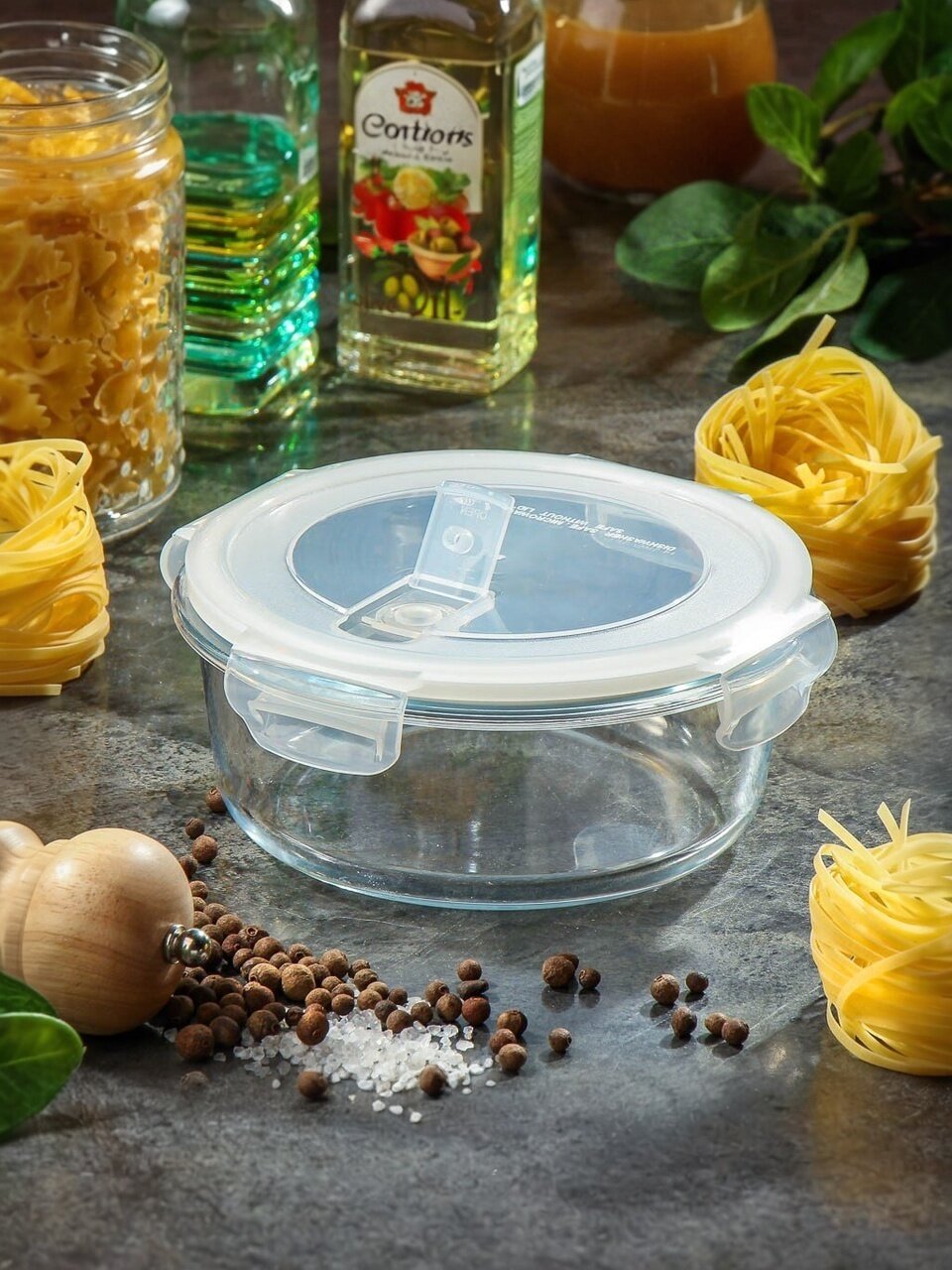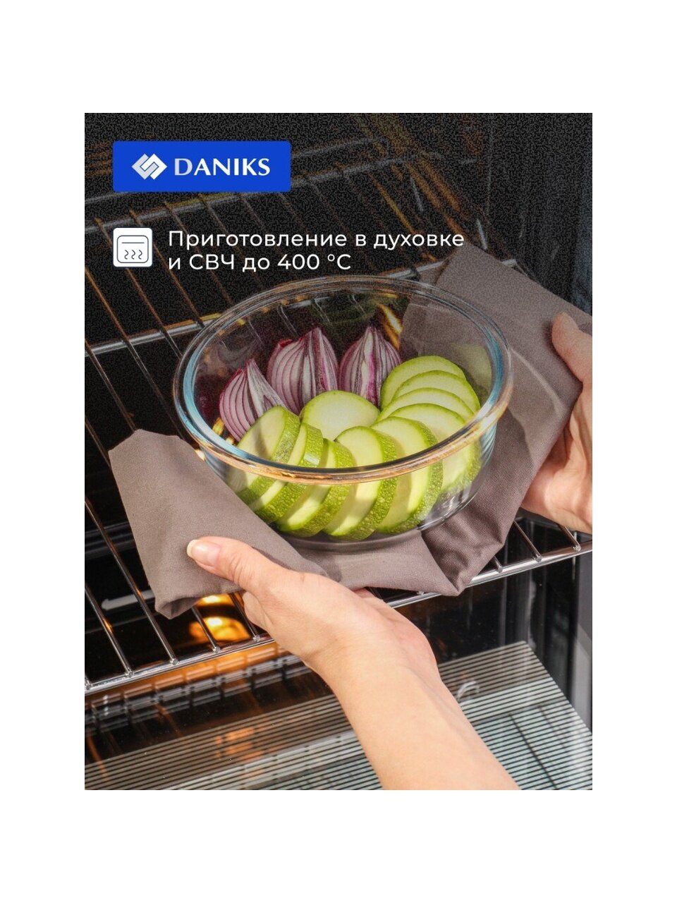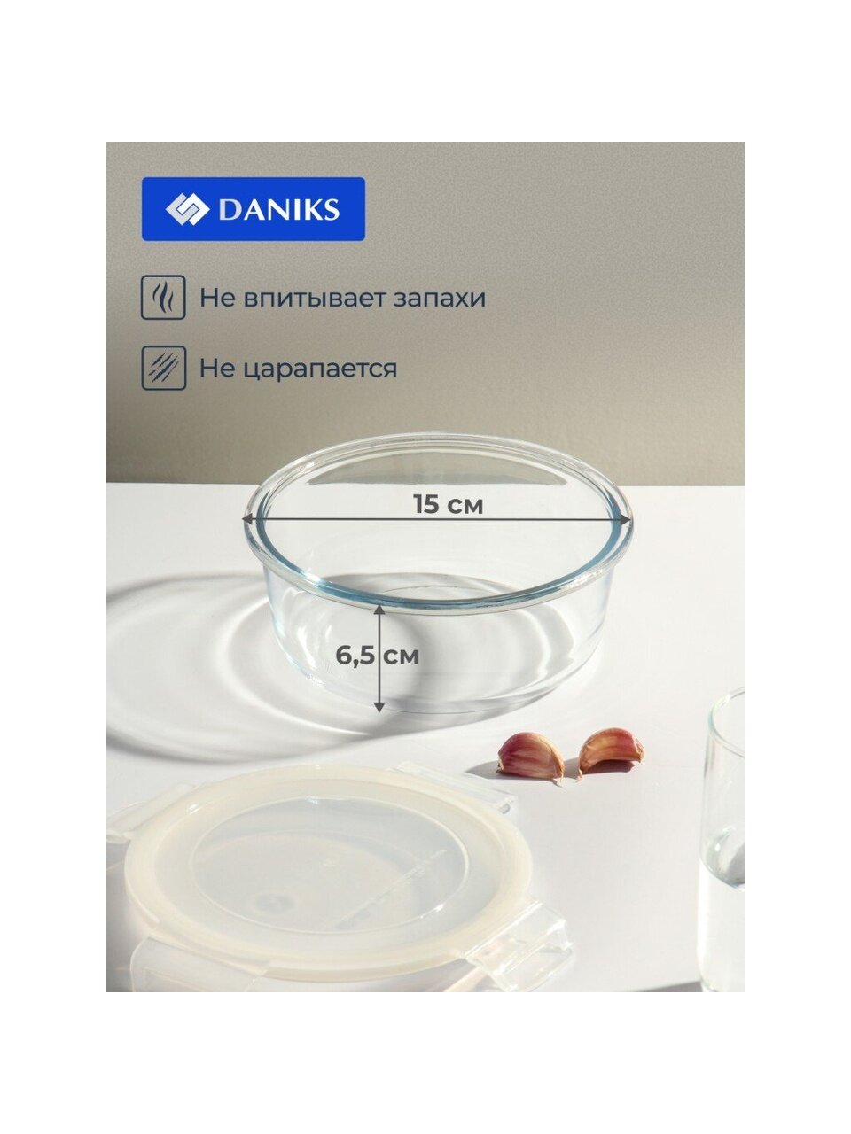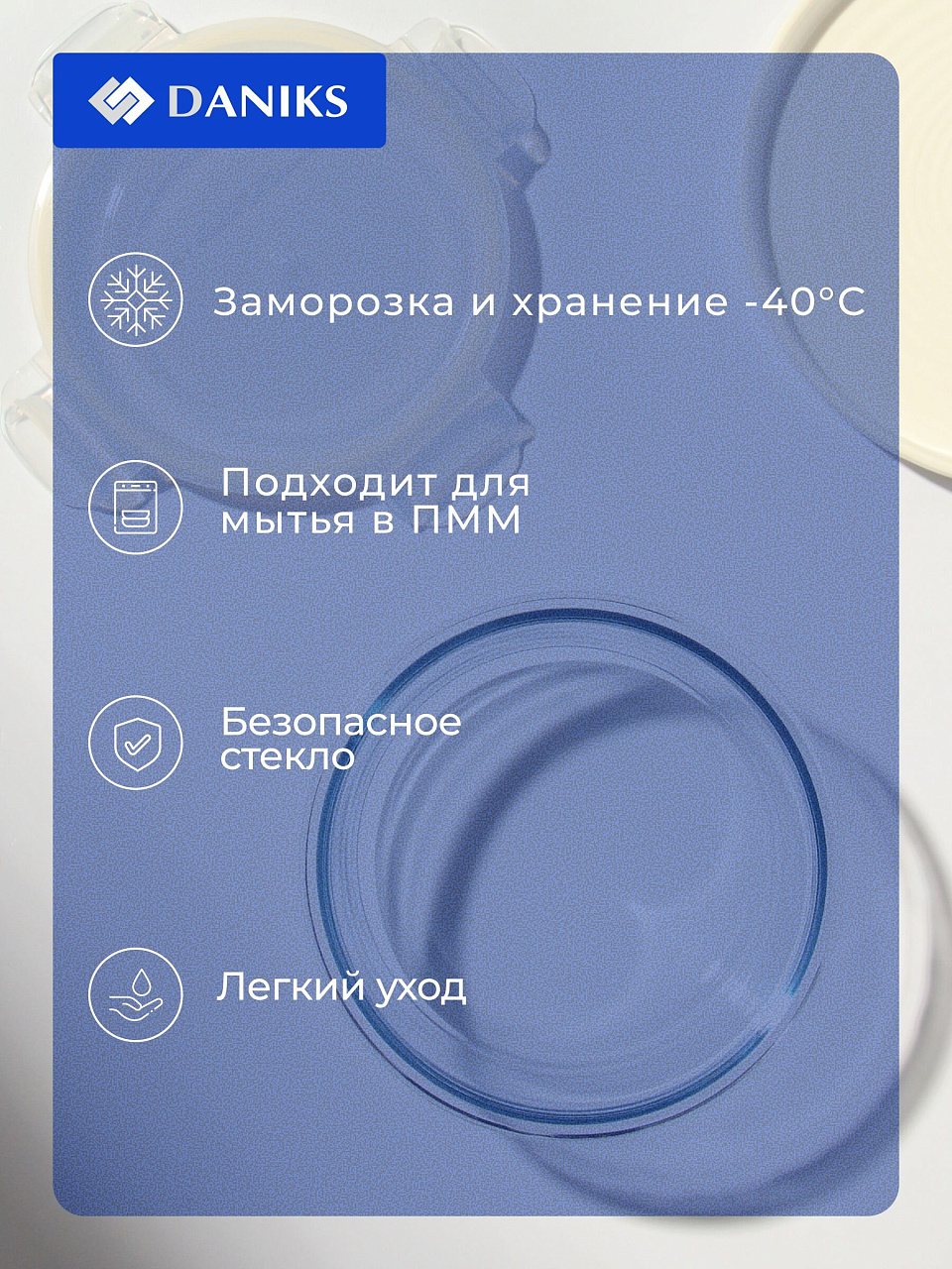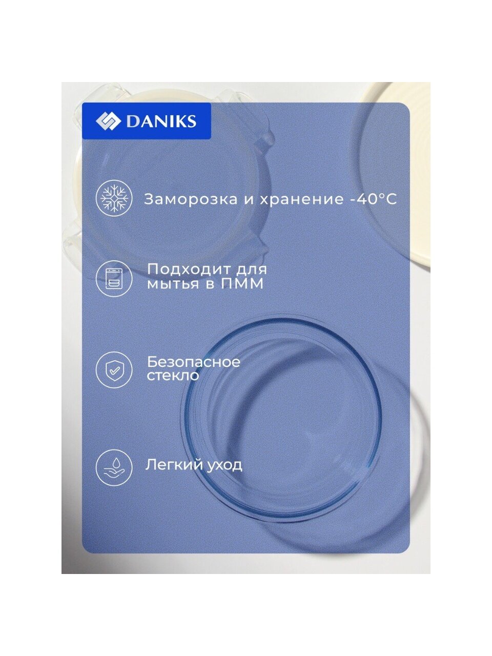 Контейнер из жаропрочного стекла Daniks 0.95 л — герметичное хранение и разогрев без переплат: удобно для дома, офиса и дачи, подходит для СВЧ и заморозки.
