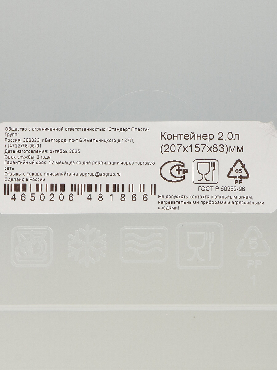 Контейнер пищевой пластик, 2 л от Стандарт Пластик Групп — это оптимальный выбор для хранения и транспортировки продуктов. Прямоугольная форма и прозрачный материал позволяют легко контролировать содержимое, а прочный пластик подходит для использования в холодильнике, морозильной камере и микроволновой печи. Если вы ищете, какой контейнер выбрать для хранения еды или как выбрать контейнер для заморозки, обратите внимание на универсальность этой модели.