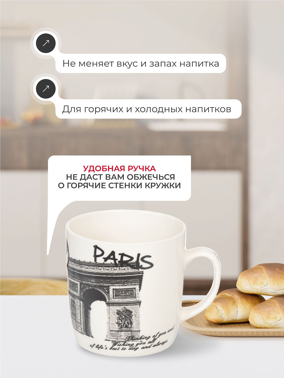- Уникальный дизайн с мотивами городов Парижа — каждая кружка украшена оригинальной надписью и иллюстрацией, что делает набор отличным подарком.