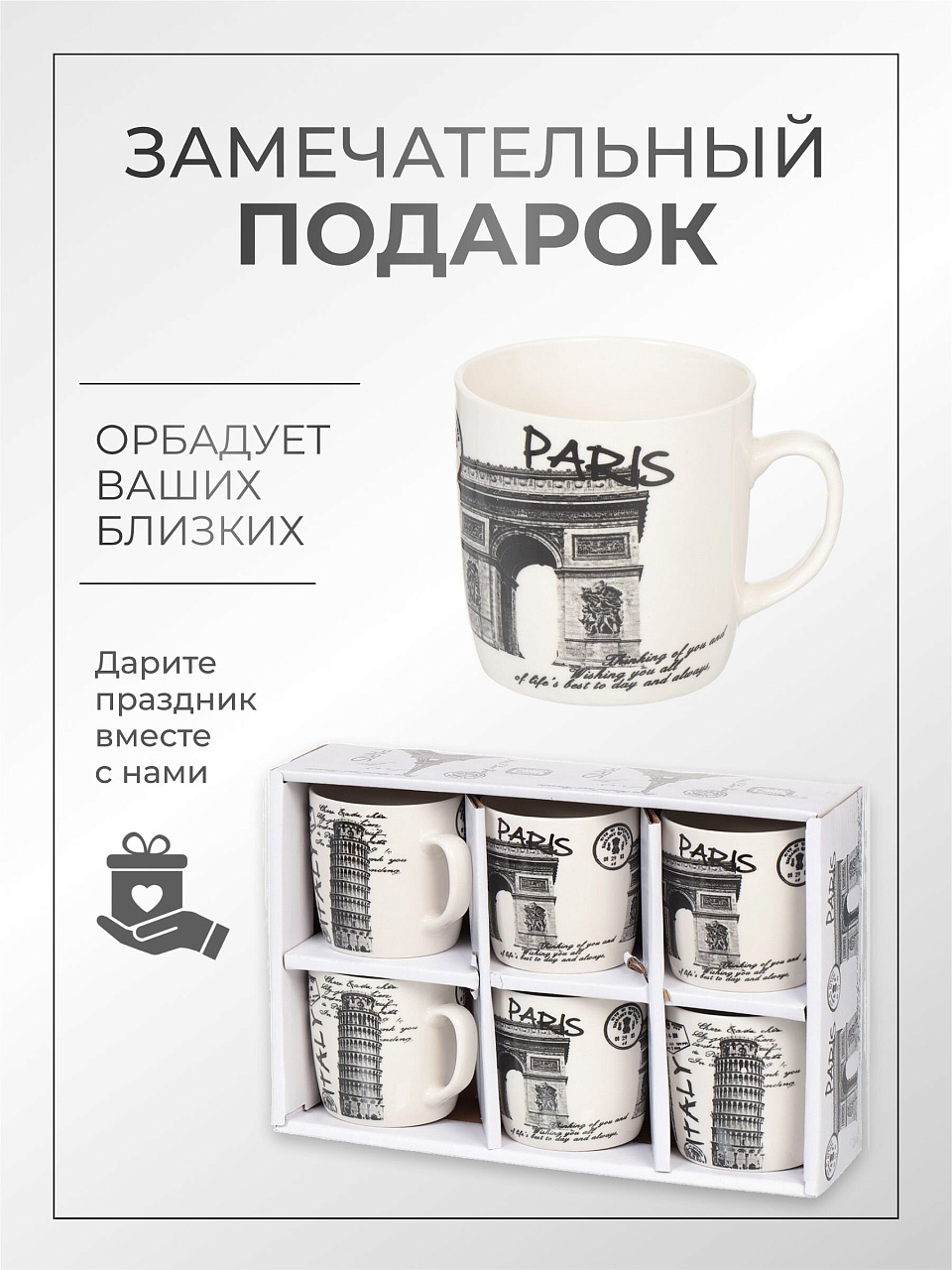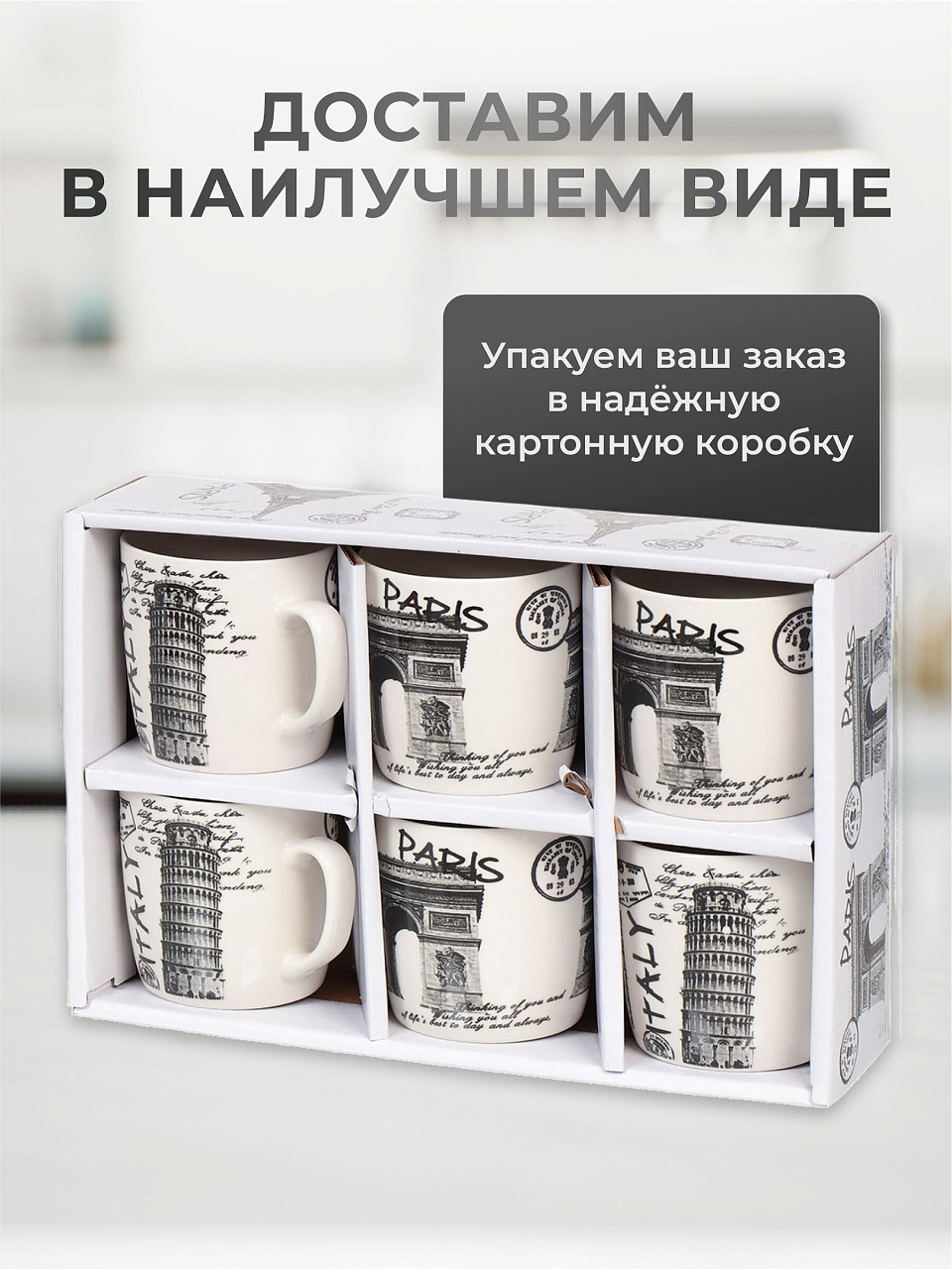 Набор керамических кружек «Париж города» 180 мл, 6 шт — стильный подарок и уют для дома, подходит для СВЧ и посудомойки, в подарочной упаковке.