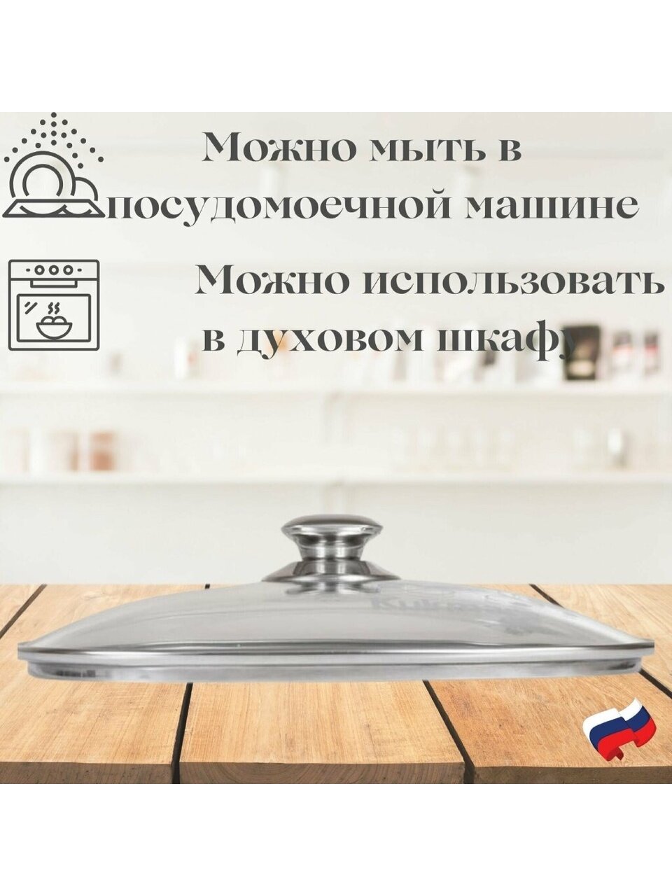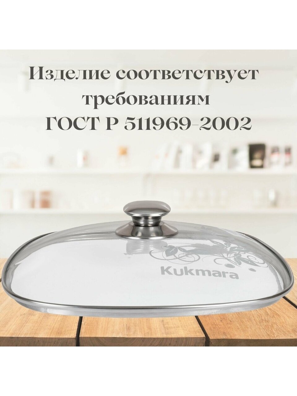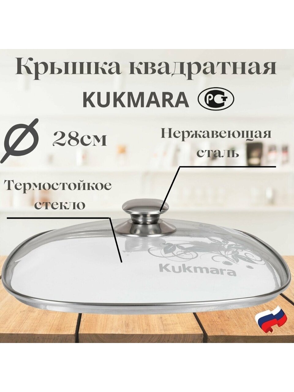 Жаростойкая стеклянная крышка для кухонной посуды производства российской компании Kukmara. Крышка сделана из экологичного закаленного стекла в соответствии с ГОСТом. Имеет удобную безопасную стальную ручку и пароотводящее отверстие для сброса избыточного давления. Края крышки защищены от сколов и других повреждений ободком из нержавеющей стали. Идеально подойдет для квадратных сковородок, сотейников, жаровен со стороной 28 см.