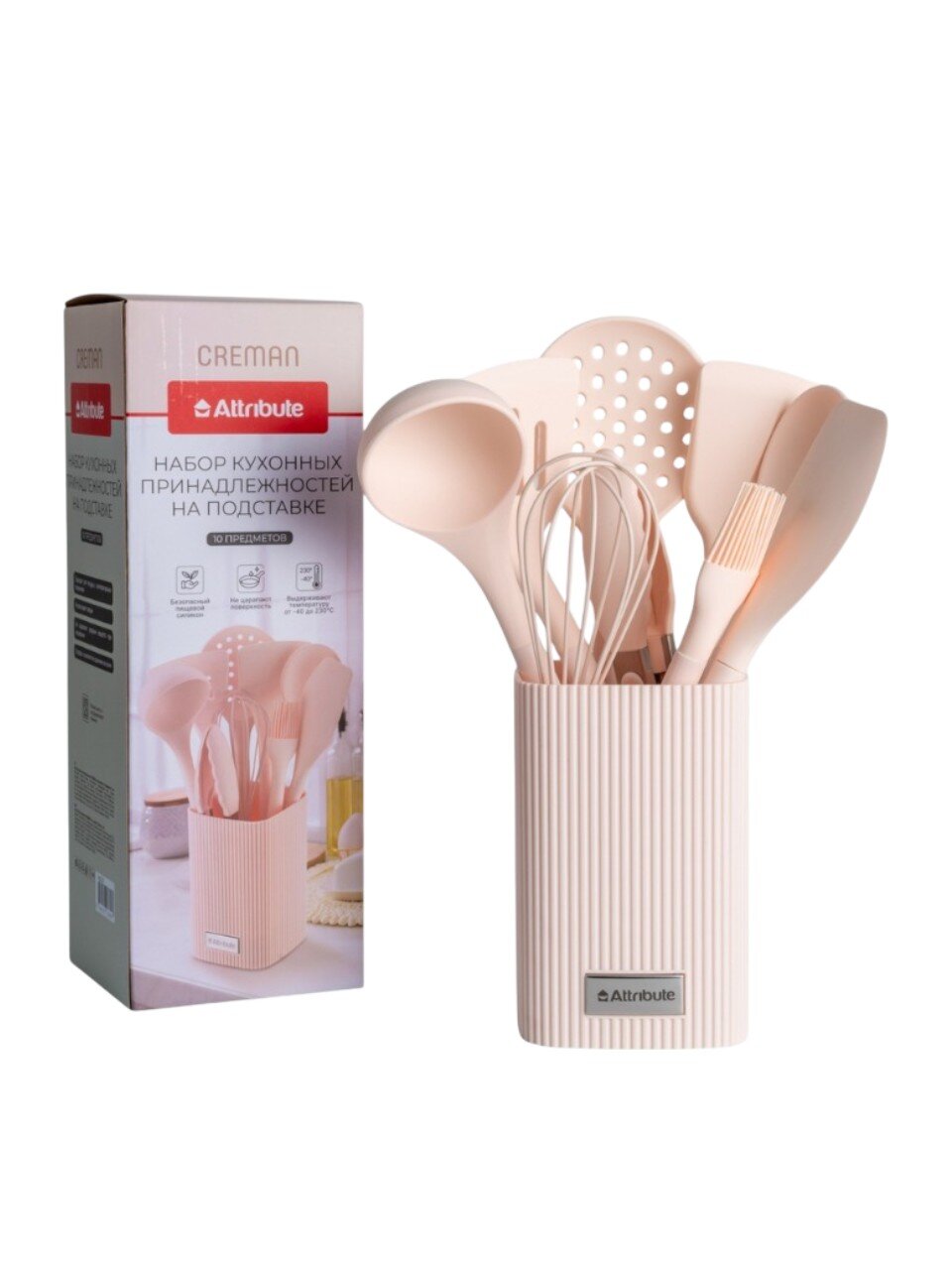 Набор кухонных принадлежностей Attribute Creman AGC222 — 10 предметов из прочного полиамида на подставке: экономьте время и место, готовьте с удовольствием.