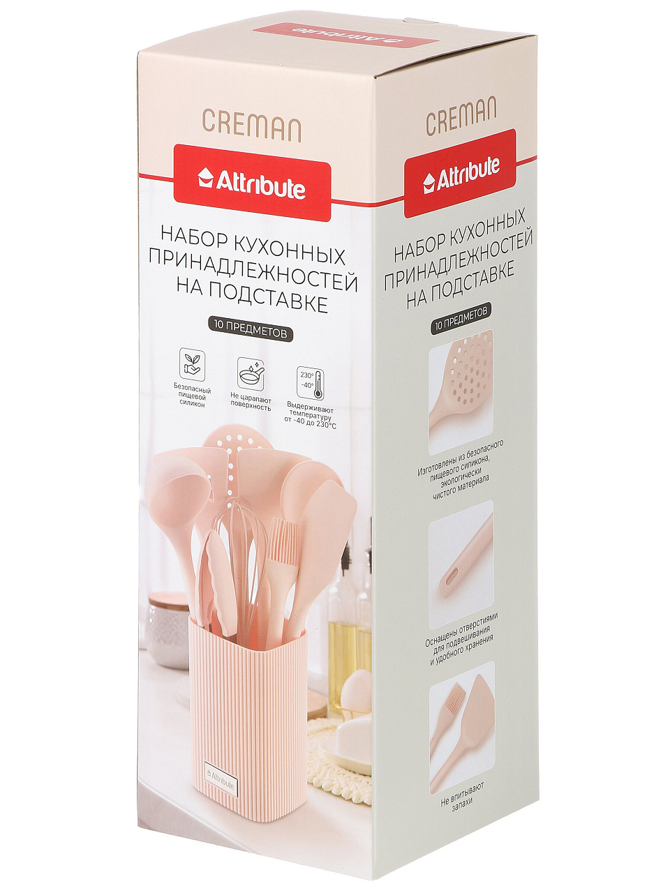 Ищете, какой набор кухонных принадлежностей выбрать для ежедневного использования? Attribute Creman AGC222 — это оптимальное решение для дома, дачи или подарка. В комплекте 10 предметов: лопатки, ложки, половник и венчик, которые подходят для любых типов посуды, включая тефлон и керамику. Прочный полиамид не впитывает запахи и легко моется — даже в посудомоечной машине.