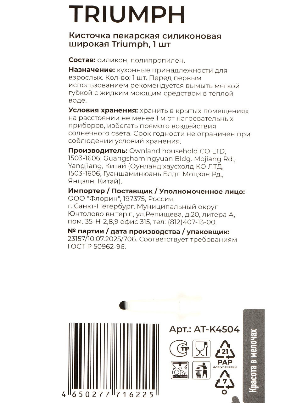 Вы можете приобрести «Кисточка кулинарная силикон, 22.5 см, навеска, Atmosphere, Triumph, AT-K4504» и другие товары в нашем интернет-магазине в Астрахани по низким ценам и с бесплатным самовывозом.