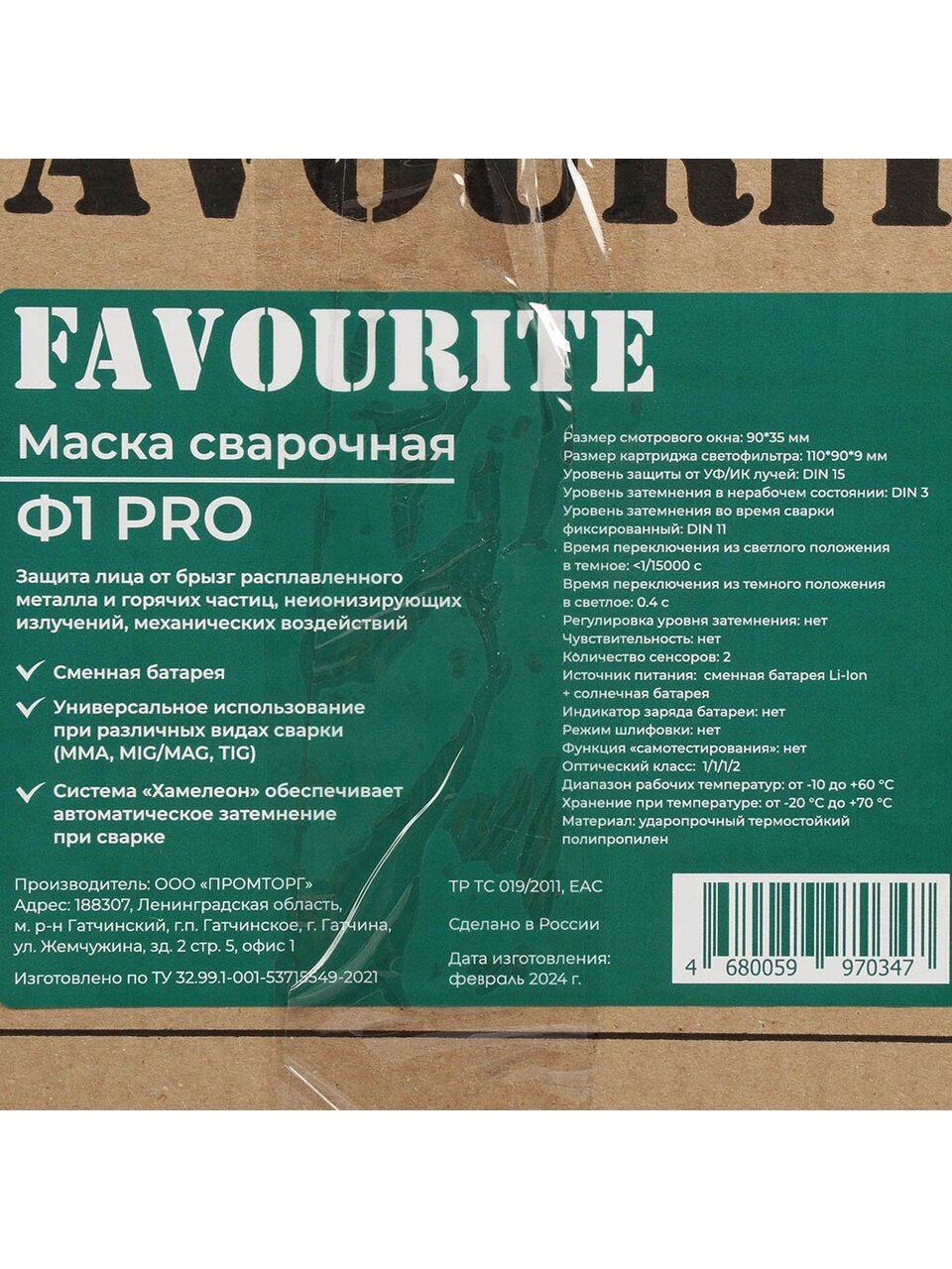Маска сварочная FAVOURITE Хамелеон PRO Ф1 90x35 мм — надежная защита глаз и лица для сварки, оптимальное затемнение DIN 3/11, индивидуальная упаковка.