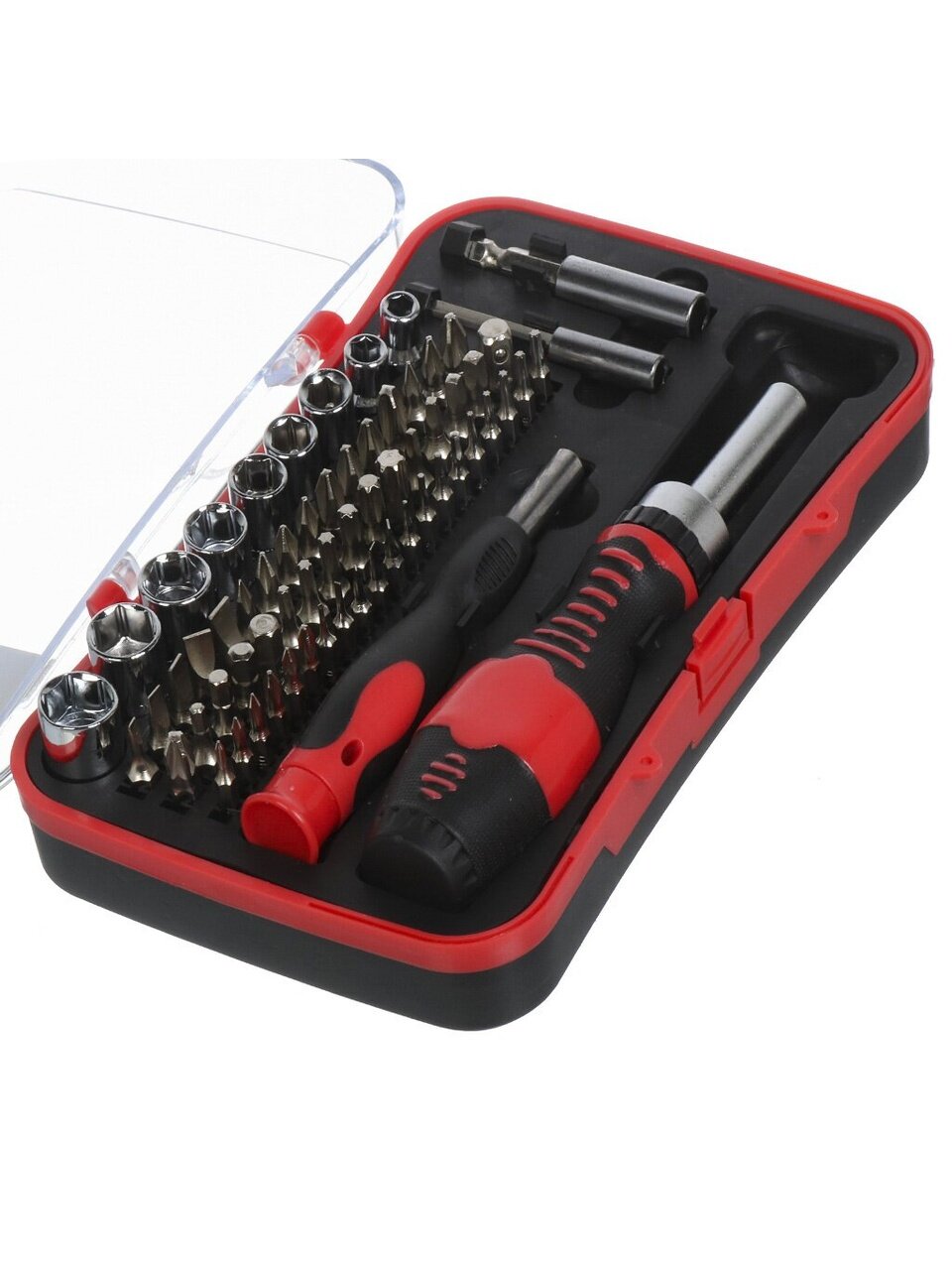 Набор включает 65 предметов, среди которых вы найдете торцевые головки и отвертки, а также ключи шестигранные. Это идеальный выбор для тех, кто ценит функциональность и простоту в использовании. Несмотря на отсутствие гаечных ключей, молотка и других инструментов, данный комплект полностью справляется с большинством бытовых задач.