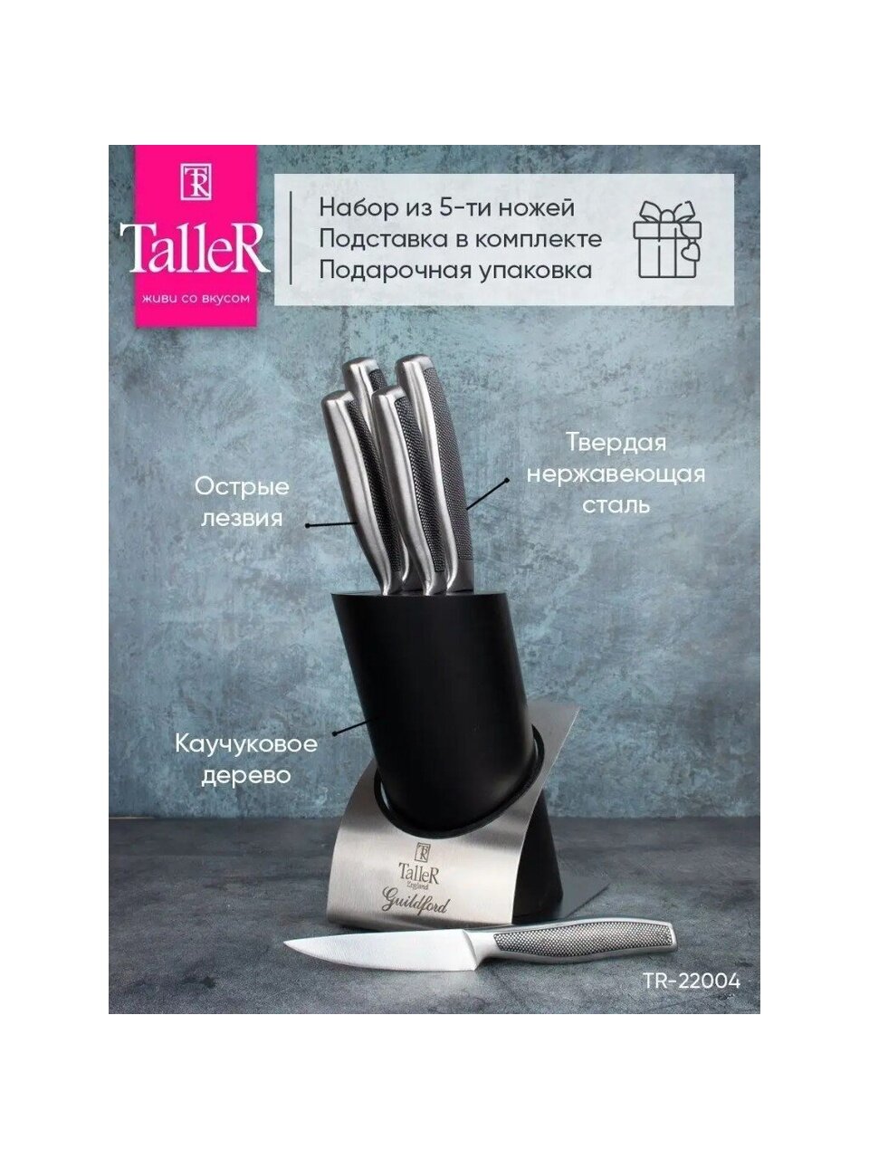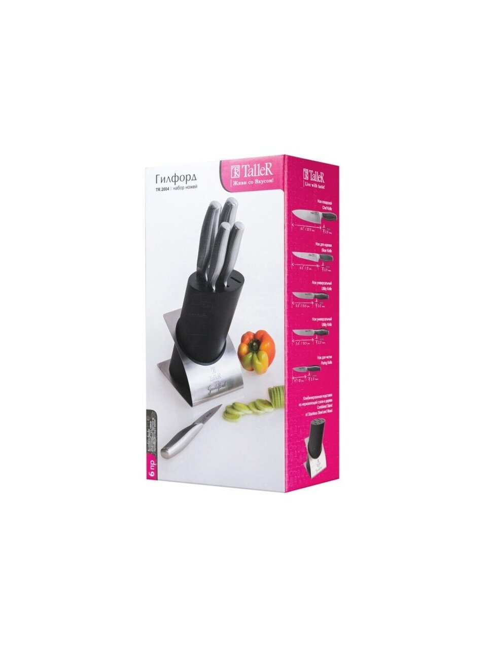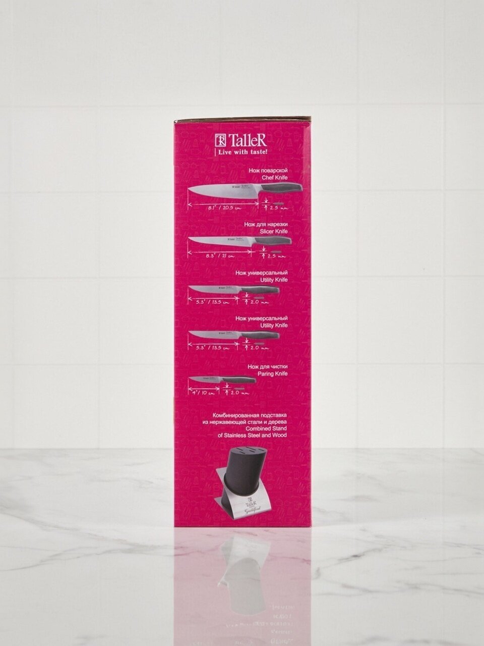 Премиальный набор ножей Taller TR-22004 — идеальный выбор для кухни, где важны стиль, надежность и функциональность. Комплект из 6 предметов создан для тех, кто ценит высокое качество, долговечность и элегантный дизайн. Современные ножи из нержавеющей стали с эргономичными рукоятками не только украсят интерьер, но и обеспечат максимальный комфорт в ежедневной готовке. Стильная подставка из каучукового дерева и нержавеющей стали гармонично впишется в любой кухонный интерьер, подчеркивая статус и вкус владельца.