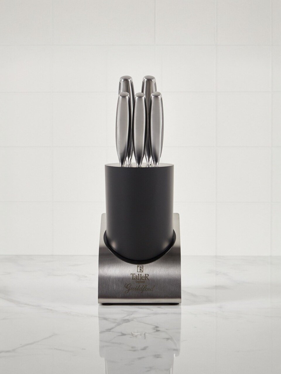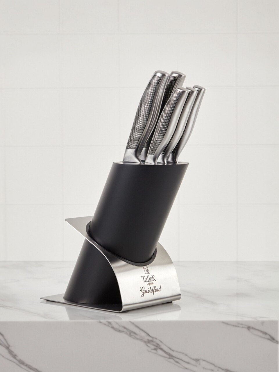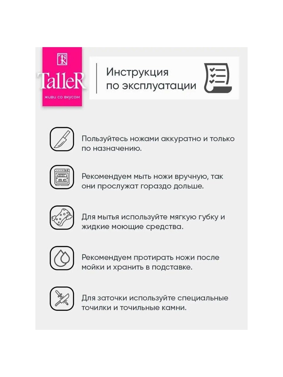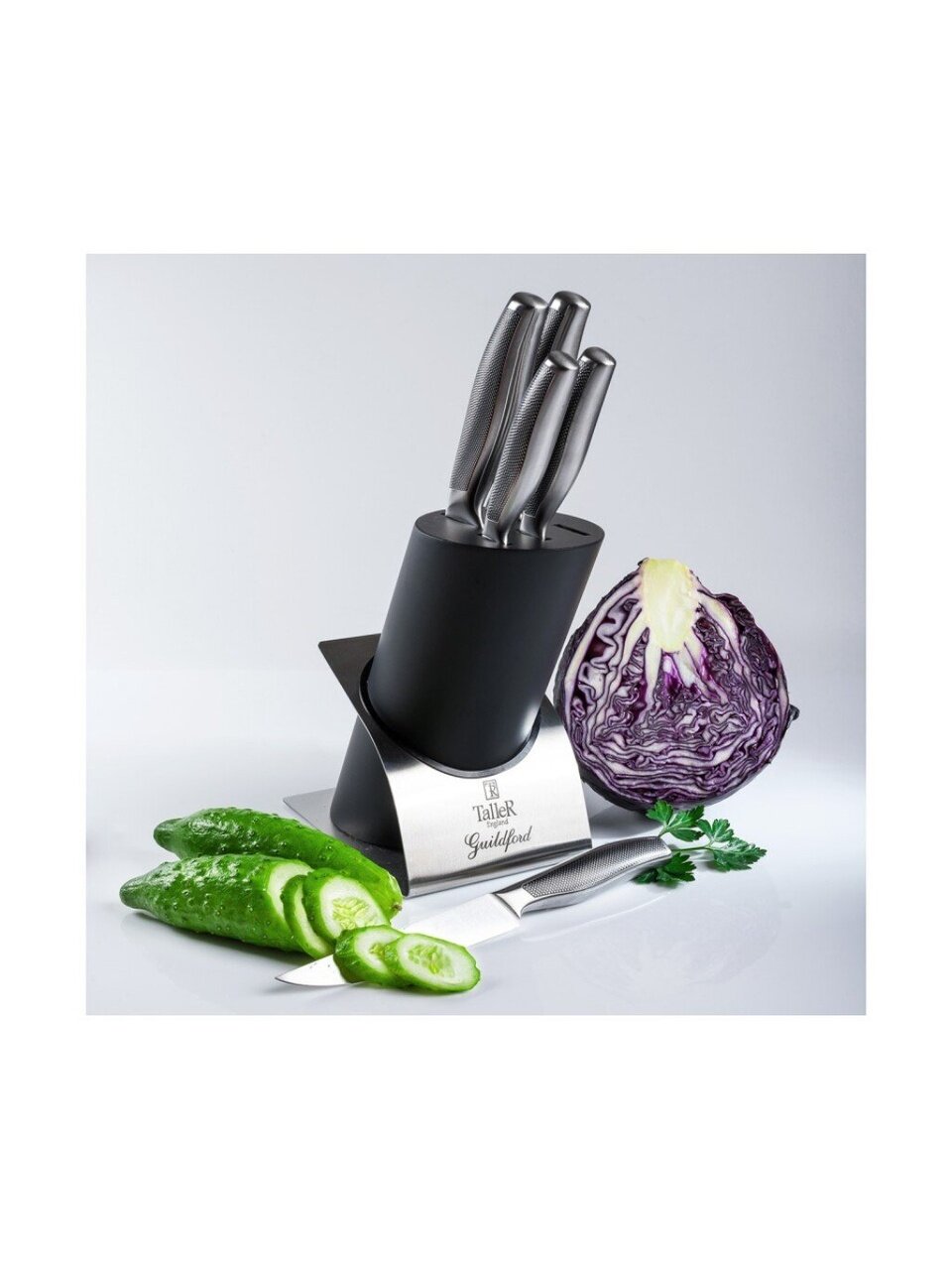 Премиальный набор ножей Taller TR-22004 — идеальный выбор для кухни, где важны стиль, надежность и функциональность. Комплект из 6 предметов создан для тех, кто ценит высокое качество, долговечность и элегантный дизайн. Современные ножи из нержавеющей стали с эргономичными рукоятками не только украсят интерьер, но и обеспечат максимальный комфорт в ежедневной готовке. Стильная подставка из каучукового дерева и нержавеющей стали гармонично впишется в любой кухонный интерьер, подчеркивая статус и вкус владельца.