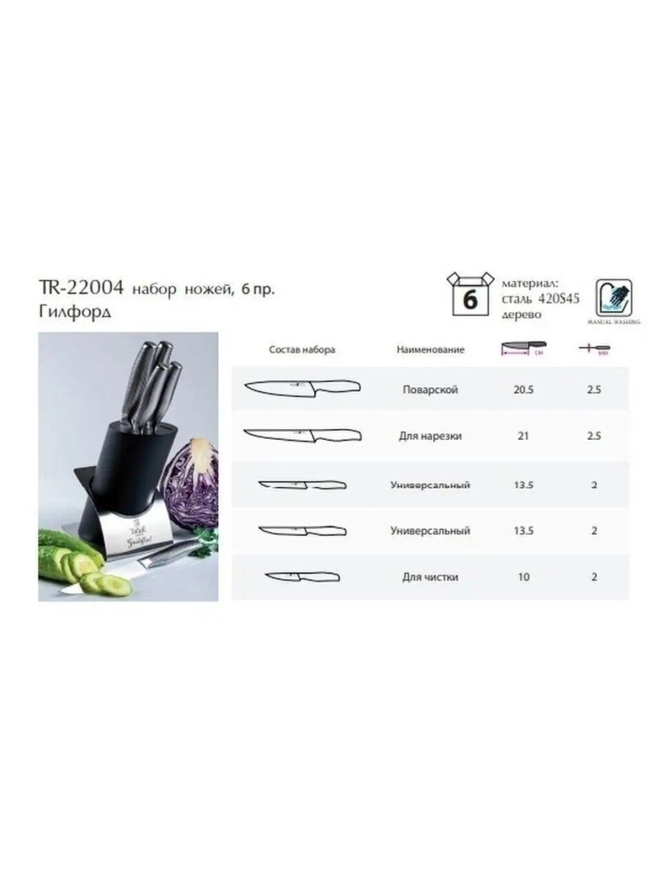 Вы можете приобрести «Набор ножей 6 предметов, 20.5, 21,13.5,13.5, 10 см, нержавеющая сталь, рукоятка нержавеющая сталь, с подставкой, каучуковое дерево, нержавеющая сталь, Taller, TR-22004» и другие товары в нашем интернет-магазине в Ставрополе по низким ценам и с бесплатным самовывозом.