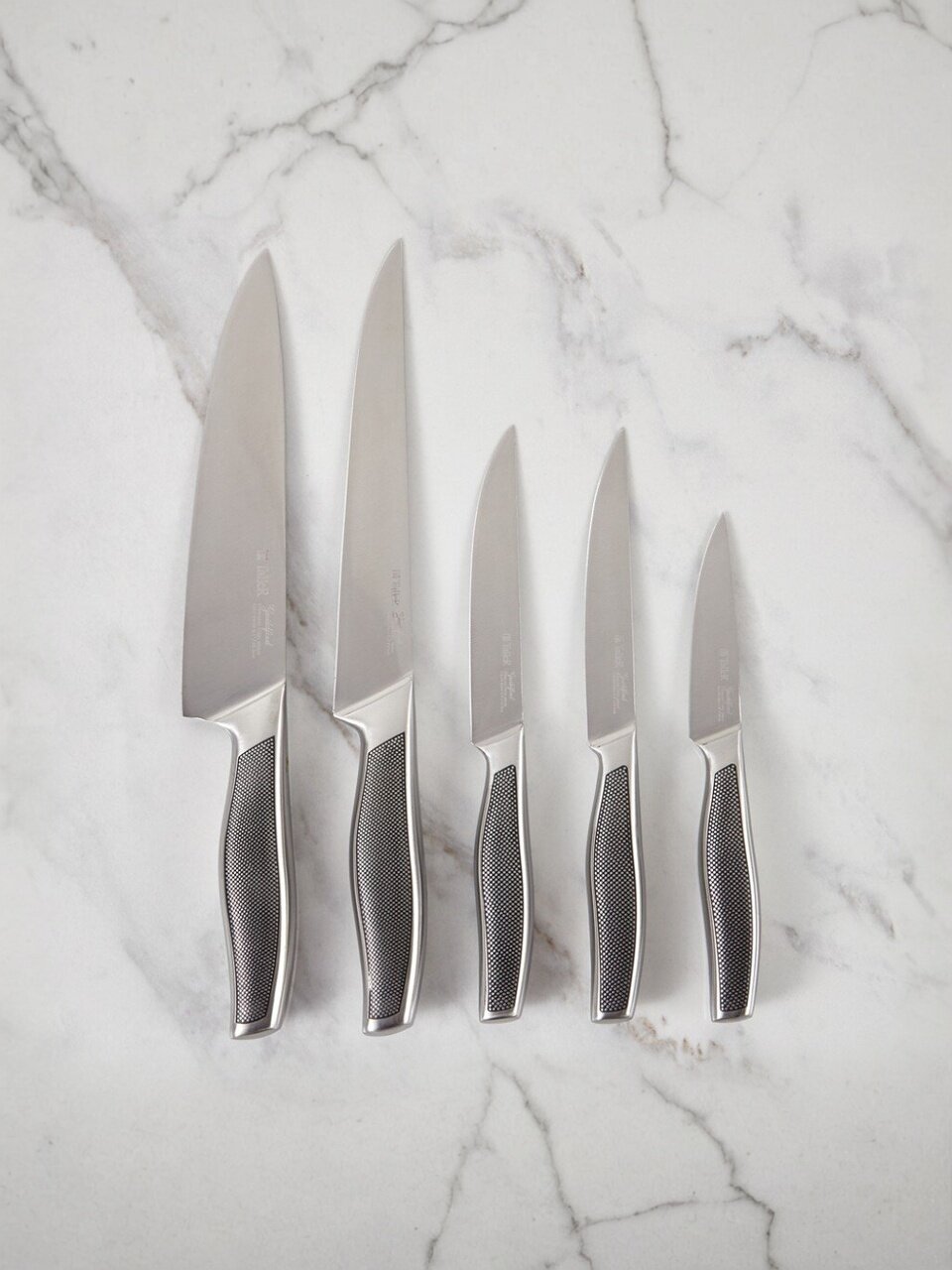 - Оптимальный набор: в комплекте шеф-нож, нож для овощей, универсальный нож, разделочный нож — все необходимое для разных кулинарных задач.