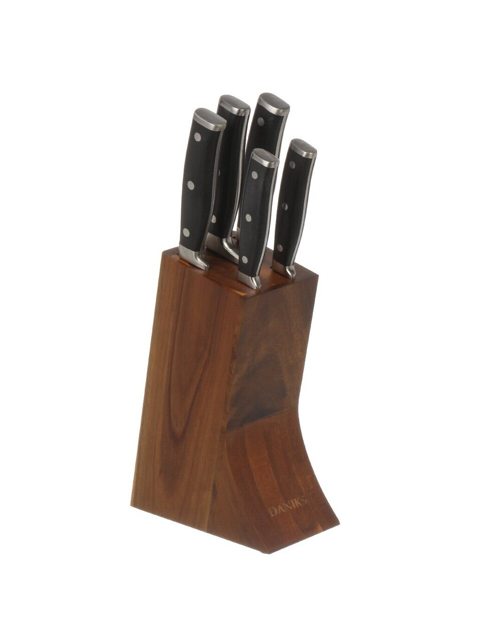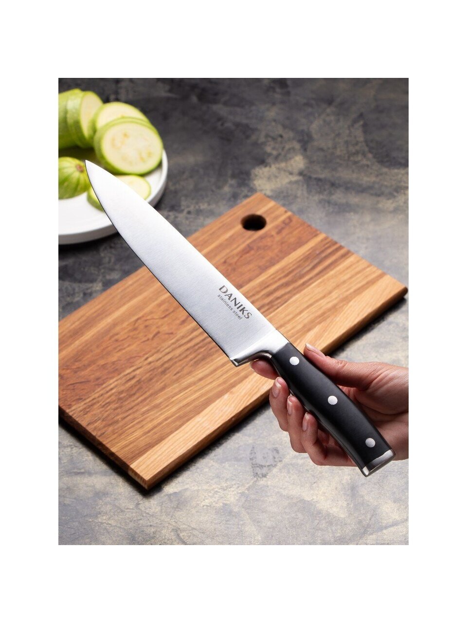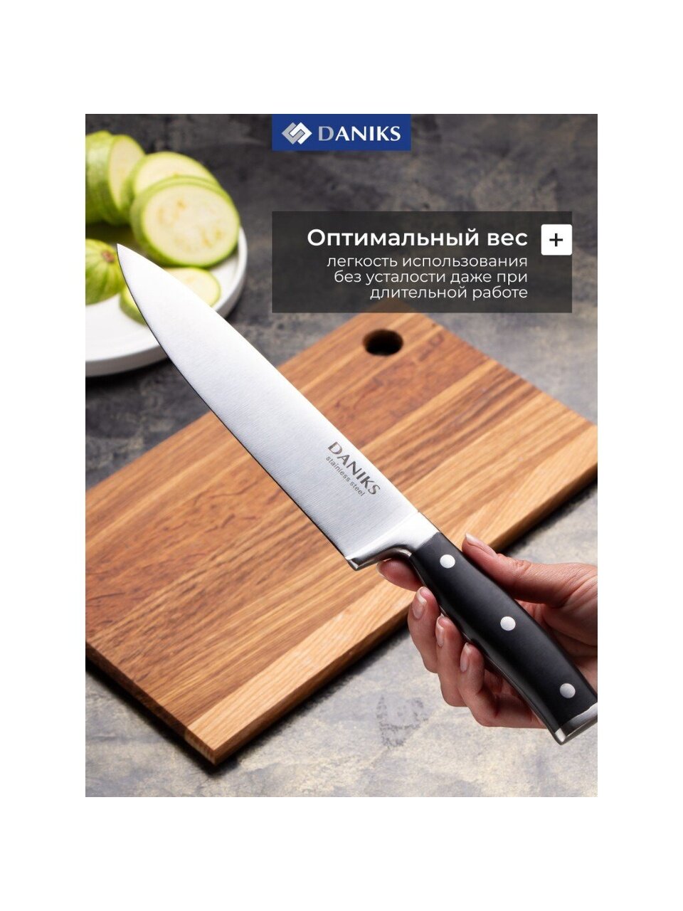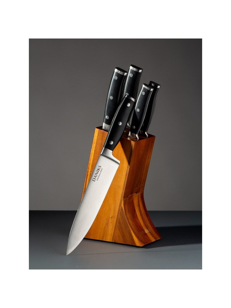 Эффектная деревянная подставка не только украсит рабочую зону, но и обеспечит безопасное хранение ножей, защищая лезвия от повреждений. Лаконичный черный цвет коллекции Daniks Black станет гармоничным акцентом на любой кухне, подчеркивая современный стиль и практичность. Все ножи можно мыть в посудомоечной машине, что значительно облегчает уход за комплектом и экономит время.