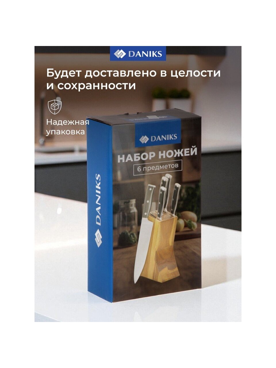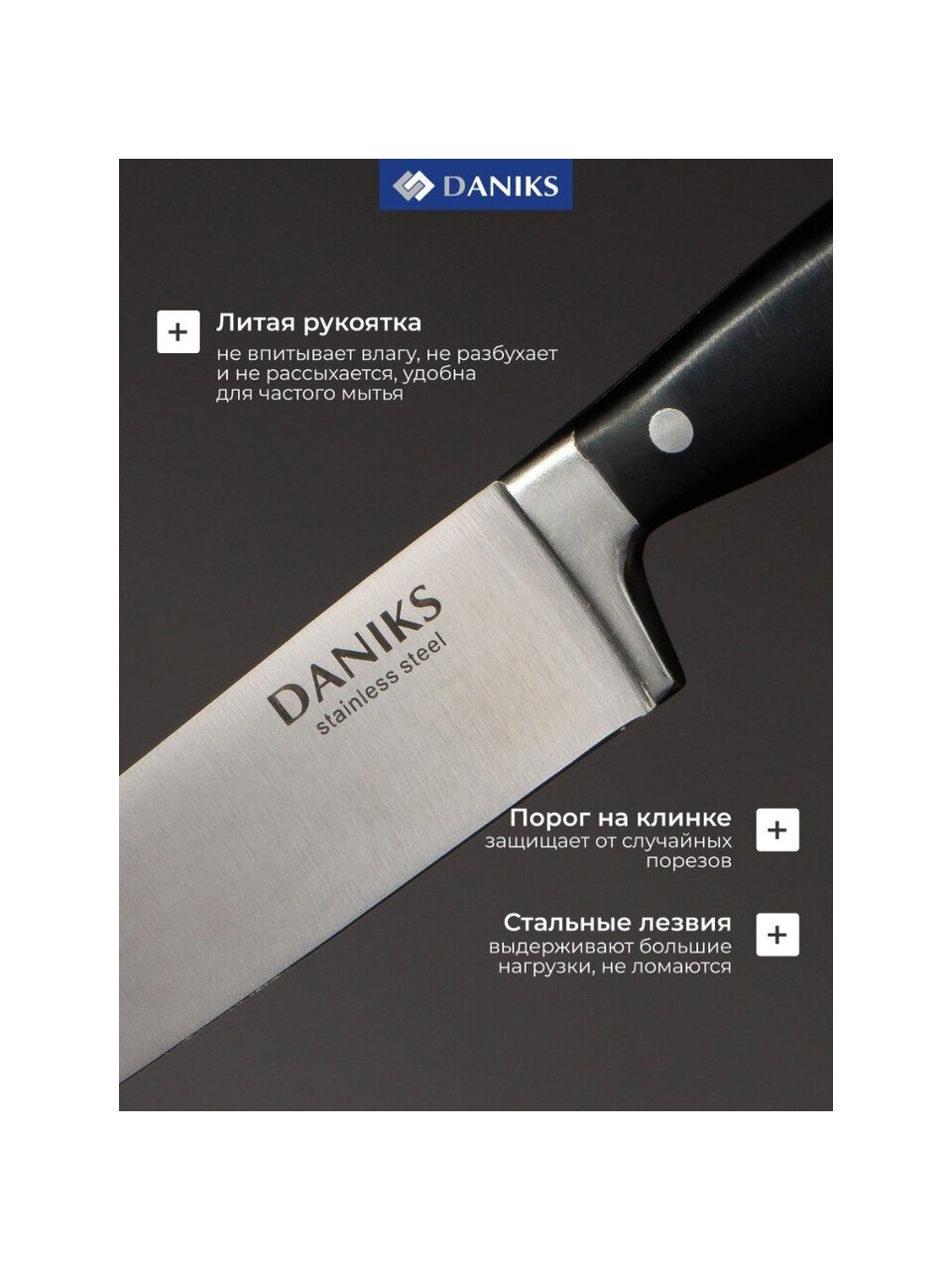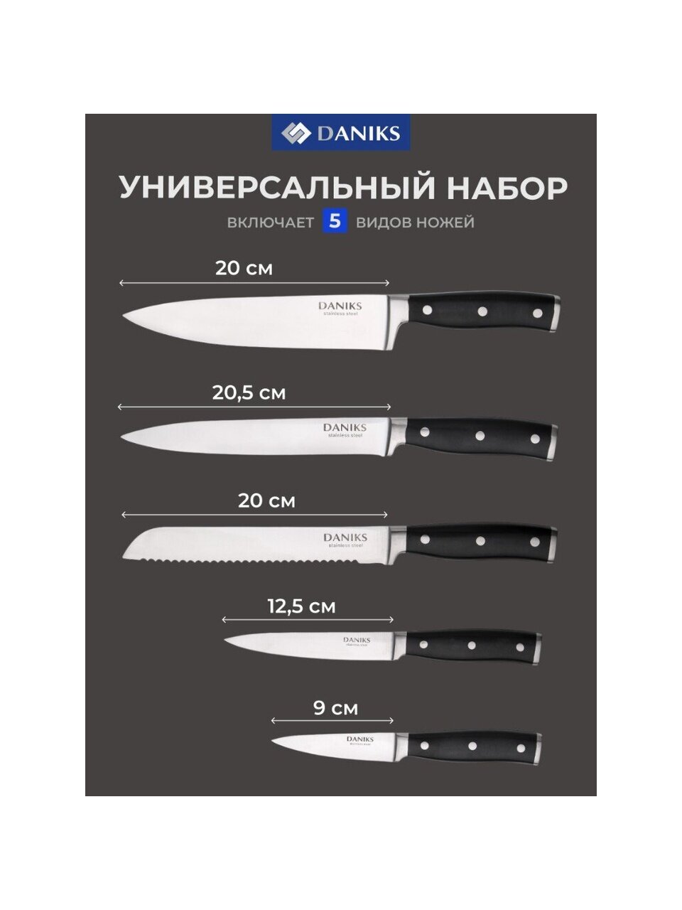 Набор ножей Daniks Black YW-A325 станет отличным выбором для тех, кто ценит качество, функциональность и стильные решения в быту. Сбалансированный комплект позволит справиться с любыми кулинарными задачами — от нарезки хлеба до тонкой шинковки овощей и мяса. Покупка этого набора обеспечит порядок на кухне, сэкономит время на поиске нужного инструмента и подарит удовольствие от процесса приготовления пищи. Продукция бренда Daniks — оптимальное сочетание цены и качества для ежедневного использования дома или на даче.