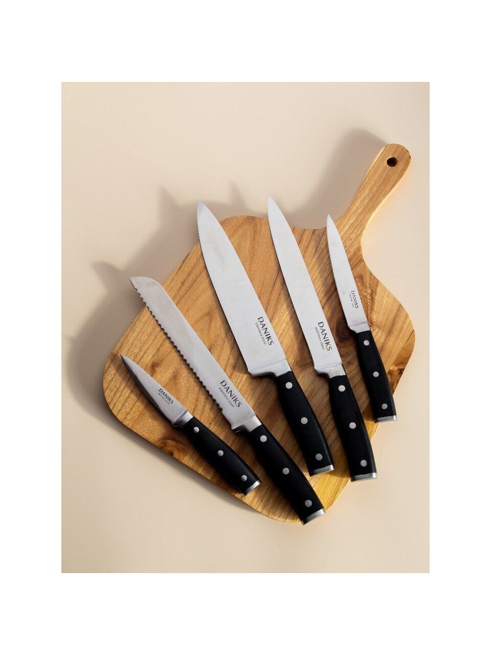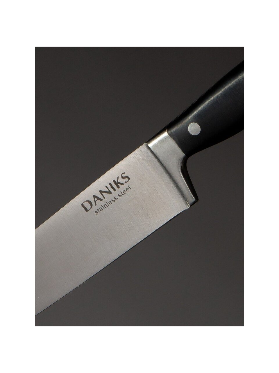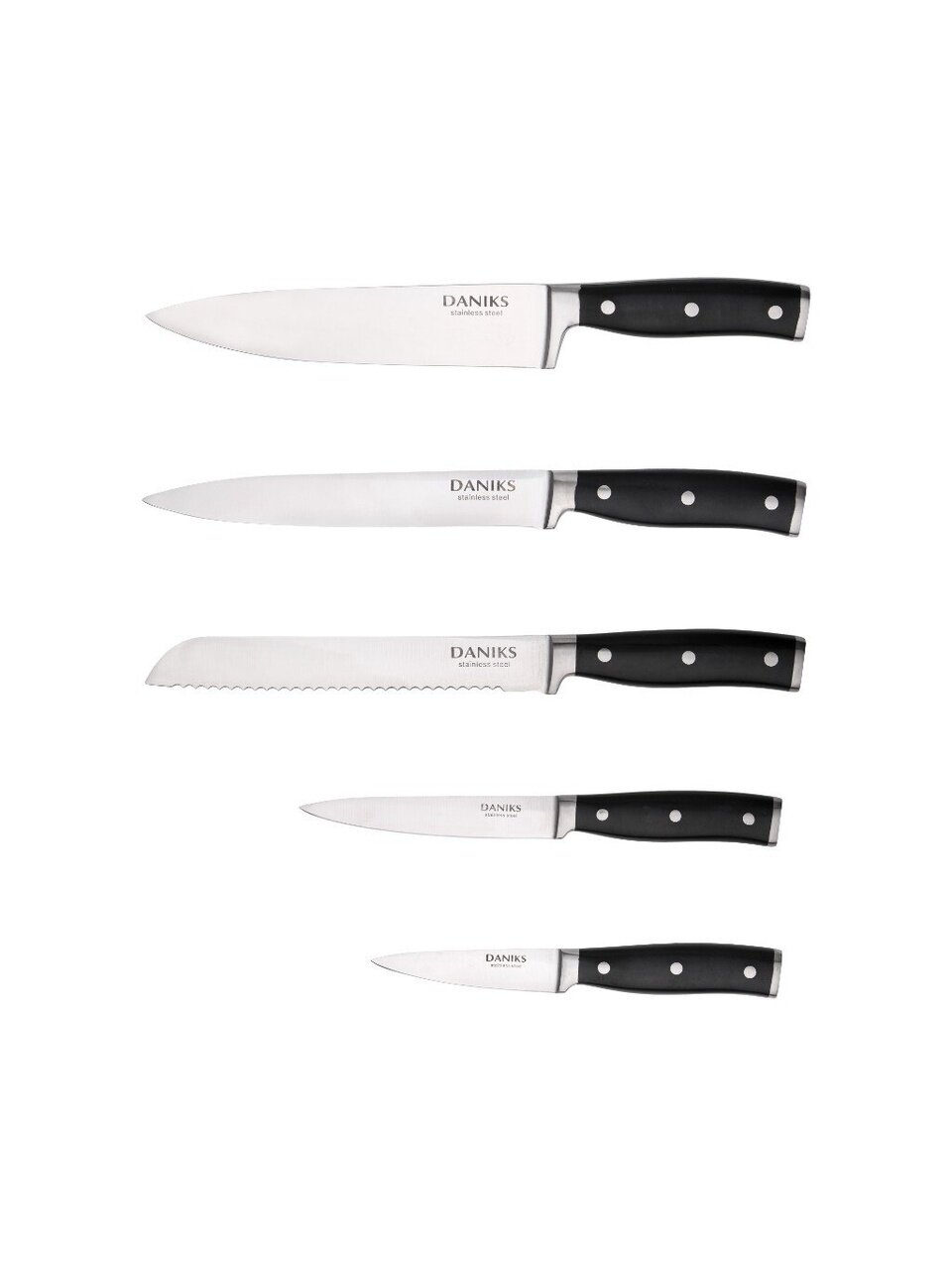 Набор ножей Daniks Black YW-A325 станет отличным выбором для тех, кто ценит качество, функциональность и стильные решения в быту. Сбалансированный комплект позволит справиться с любыми кулинарными задачами — от нарезки хлеба до тонкой шинковки овощей и мяса. Покупка этого набора обеспечит порядок на кухне, сэкономит время на поиске нужного инструмента и подарит удовольствие от процесса приготовления пищи. Продукция бренда Daniks — оптимальное сочетание цены и качества для ежедневного использования дома или на даче.