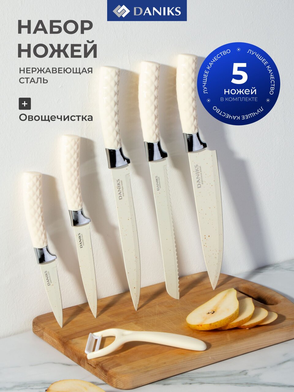 Стильный набор ножей Daniks YW-A454-PB — идеальное решение для современной кухни и отличный подарок для ценителей функциональности и эстетики. Белый цвет и элегантная подарочная упаковка делают комплект привлекательным для любого интерьера, а прочные материалы гарантируют долгий срок службы. Набор включает пять ножей и овощечистку, что обеспечивает универсальность использования: от нарезки хлеба до чистки овощей. Эргономичные пластиковые рукоятки обеспечивают удобство и безопасность при работе, а лезвия из нержавеющей стали сохраняют остроту даже при интенсивном использовании.