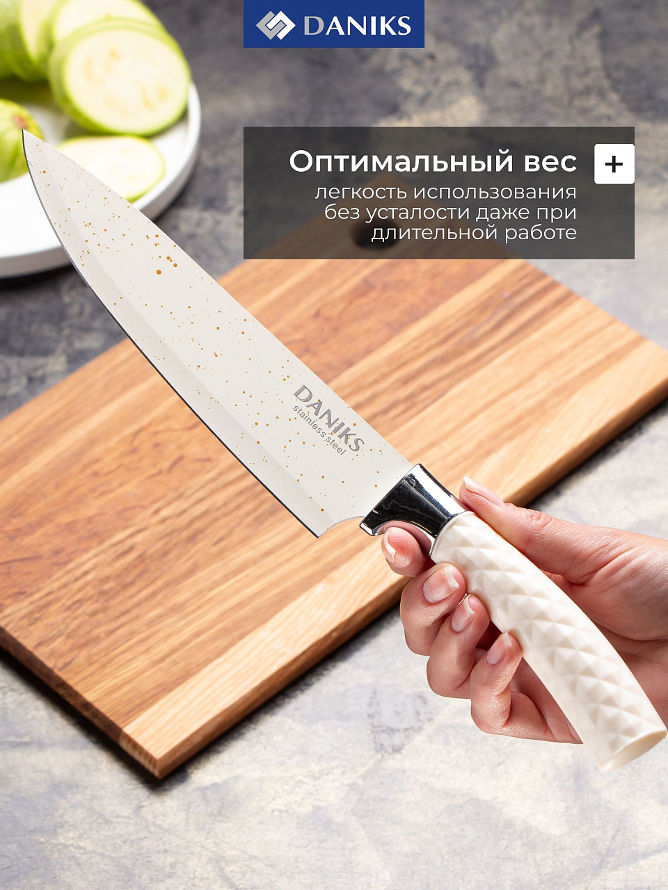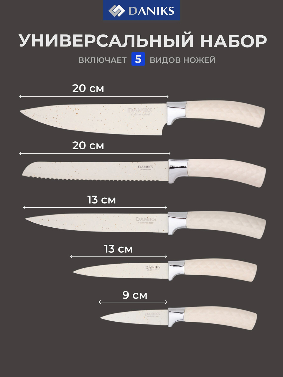 - универсальность: комплект включает шеф-нож, нож для овощей, универсальный нож, хлебный нож, разделочный нож и овощечистку;
