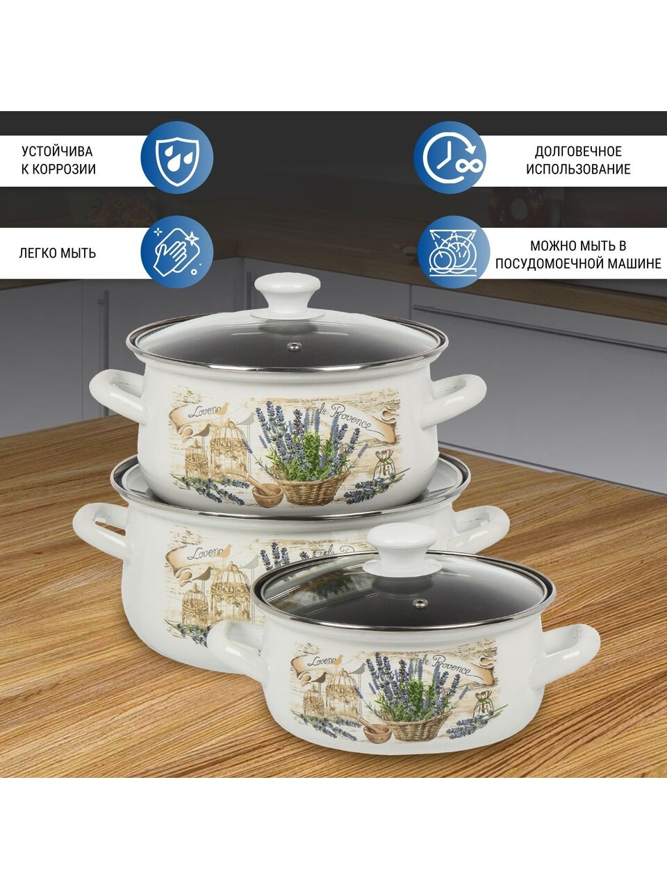 В комплекте три кастрюли разного объёма, что удобно для приготовления любых блюд. Эмалированная сталь не ржавеет, легко очищается и сохраняет вкус продуктов.