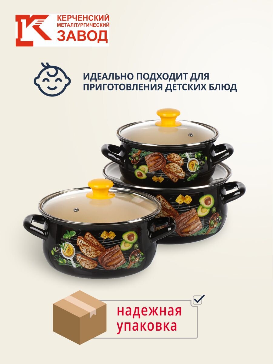 Набор кастрюль из эмалированной стали 2/3/4 л Керченский завод: долговечность, универсальность, стильный коричневый дизайн для кухни и дачи.