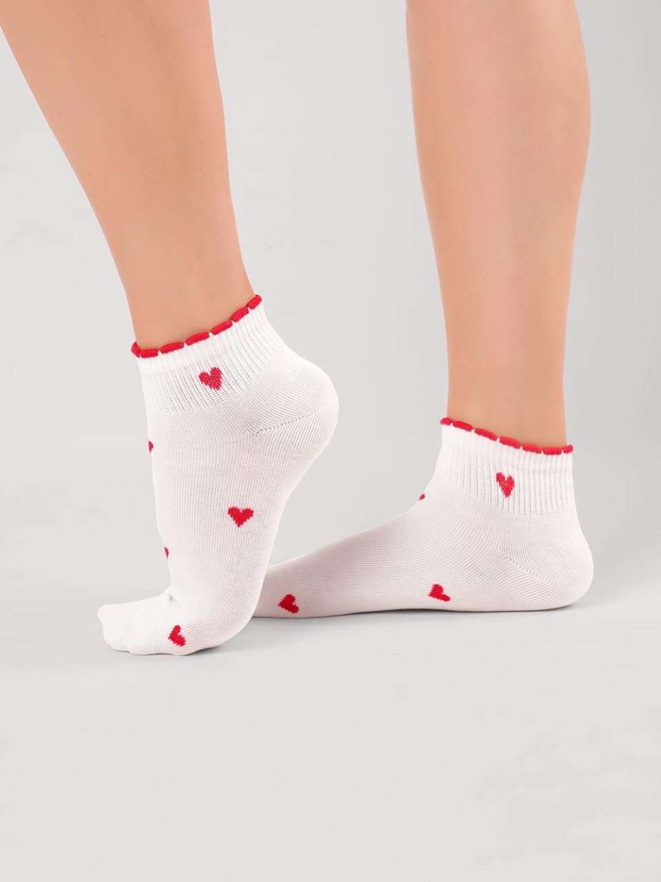 - Дизайн с акцентом: короткие белые носки с узором «сердце» — выделяют стиль даже в домашней обстановке.