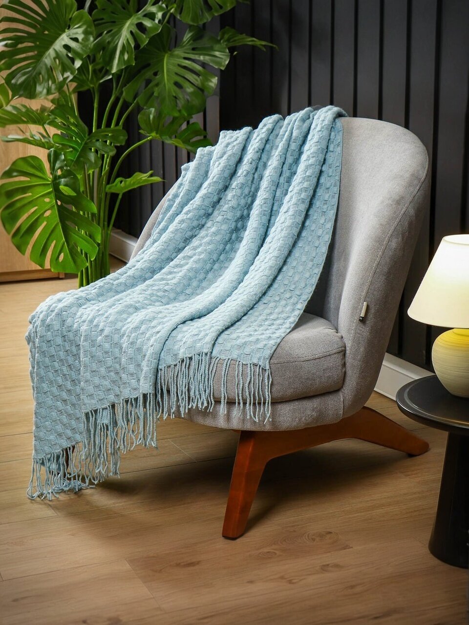 - Уникальный вязаный орнамент и трендовый небесно-голубой цвет — акцент в современном интерьере