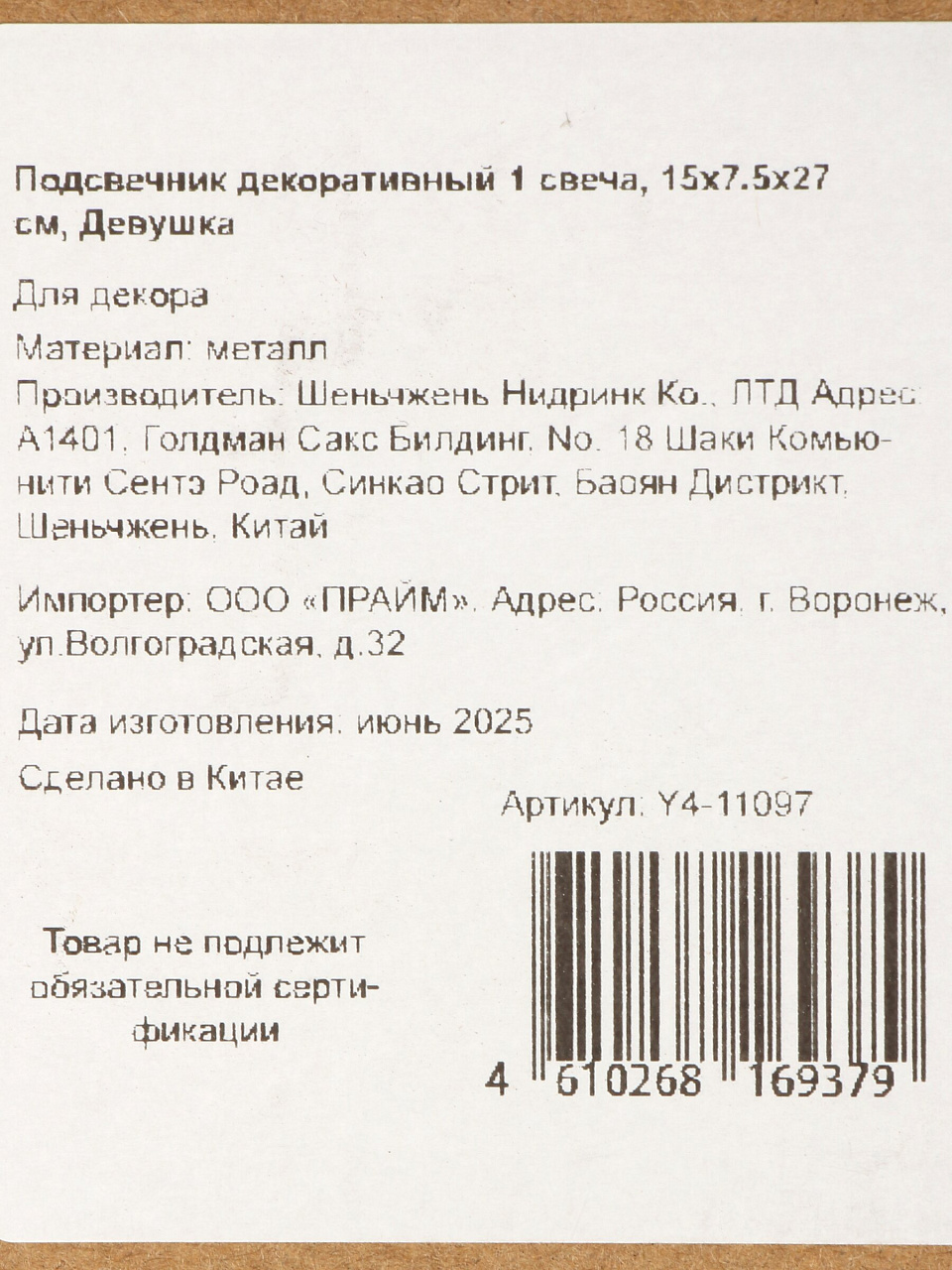 Подсвечник декоративный металл, 1 свеча, 15х7.5х27 см, Девушка, Y4-11097
